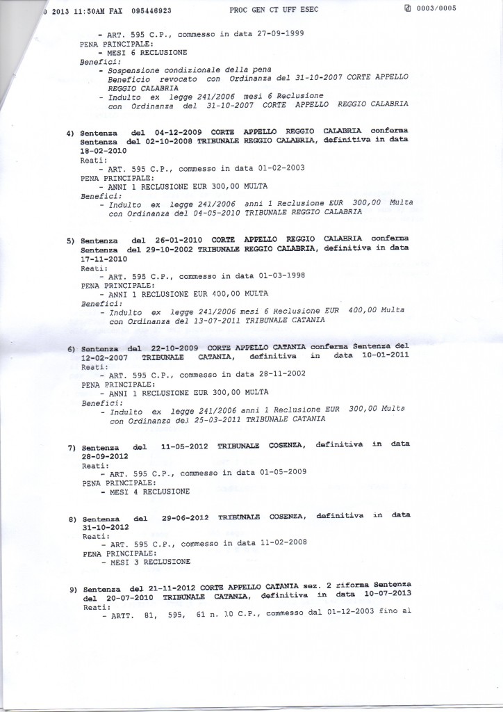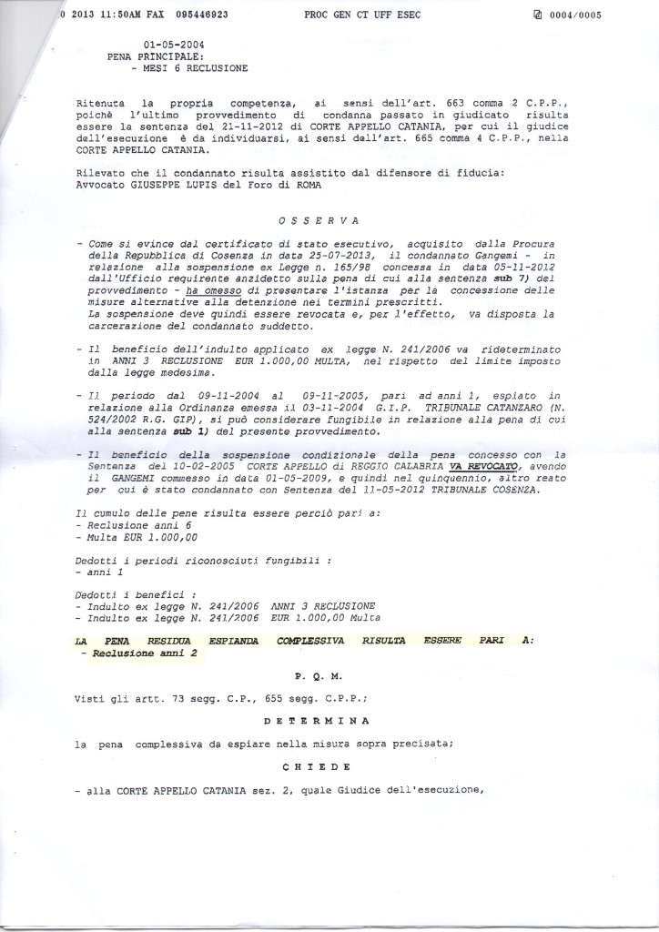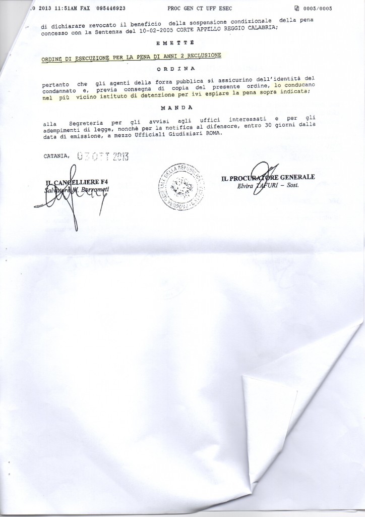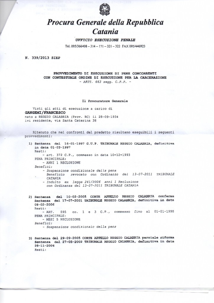 Ieri mattina, due uomini ed una donna della Polizia di Stato di Reggio di Calabria (garbatissimi ed al contempo sconcertati per il dover adempiere a simile ordine ricevuto), proprio nel giorno della visita in Città del loro Capo dr. Alessandro Pansa, dando esecuzione ad un “Provvedimento di esecuzione di pene concorrenti con contestuale ordine di esecuzione per la carcerazione” (artt. 663 segg. C.P.P.) (in basso) emesso dalla Procura Generale della Repubblica di Catania ed a firma del Sostituto Procuratore Generale Elvira Tafuri, hanno dapprima accompagnato in Questura e, poi, alla Casa Circondariale “San Pietro”, il pericolosissimo giornalista reggino Francesco Gangemi. Colpevole di cosa? Associazione a delinquere, truffa, estorsione, omicidio colposo o premeditato? Rapina, stupro, molestie e maltrattamenti? Rapina, corruzione, abuso d’ufficio o traffico di rifiuti radioattivi? Nulla di tutto questo, ovviamente. La pericolosità sociale del Gangemi, che impone al Tribunale di emettere tale provvedimento e che lo relega il reo in una cella delle patrie galere è dovuta all’aver commesso nientepopodimeno che il reato di… diffamazione a mezzo stampa (art. 595 C.P.). Minchia, signor Tenente (come cantava Giorgio Faletti)! In sostanza non un reato “veniale” come potrebbe essere l’omicidio colposo (magari commesso guidando sotto l’effetto di alcol e/o droga per il quale al reo sono concessi gli arresti domiciliari) o l’abuso d’ufficio (magari commesso in ambienti istituzionali per il quale al reo è comunque garantita la libertà fino a dopo il terzo grado di giudizio e, fors’anche, dopo). No, il reato gravissimo di cui si è macchiato il Gangemi è addirittura “diffamazione a mezzo stampa” durante la propria direzione de “Il Dibattito”. Oddio, in verità ne ha commesso anche un altro di reato (quello specificato al punto 1) del provvedimento: quello di cui all’art. 372 C.P. (“falsa testimonianza”). A proposito di quest’ultimo, sapete perché è stato condannato? Perché non ha rivelato, dinnanzi al Giudice, le proprie fonti. Gli ultraquarantenni come me ricorderanno certamente il cosiddetto “scandalo delle fioriere” o “tangentopoli reggina” che investì la Città della Fata Morgana nel 1992. In quell’epoca, l’intera Giunta Licandro venne arrestata (tranne il Licandro che si pentì e collaborò finendo anche tra la letteratura con il libro a 4 mani “La città dolente”) per aver preso tangenti da una ditta per la fornitura di fioriere del valore di 90 milioni di vecchie lire. Mio padre, all’epoca Consigliere comunale, se non ricordo male ancor prima che scattassero le manette alla Giunta, in aula a Palazzo San Giorgio, si alzò dallo scranno ed affermò che in qualche stanza le valigette entrano piene (di soldi) e ne uscivano vuote. Al processo che ne seguì, interrogato dal Giudice, si rifiutò categoricamente di rivelare chi ed in che circostanza gli diede la notizia. Reato gravissimo, quello commesso da mio padre. Vero? Adesso so che vi stupirò scrivendo, consapevolmente, che le sentenze si rispettano! Si discutono e si commentano, certo, ma si rispettano. Chiunque ne sia il soggetto destinatario, anche mio padre! Detto questo, con la convinzione di chi ha avuto in eredità dal padre proprio rettitudine, onestà e, soprattutto, dignità, a me non resta che discuterne un po’. Posso, per esempio, dire che per reati molto più gravi si rimane liberi (magari di reiterarli); posso, per esempio, dire che mio padre ha da poco compiuto 79 anni; posso, per esempio, elencare tante di quelle patologie gravi che affliggono mio padre da riempire cartelle cliniche di quasi tutte le specializzazioni mediche esistenti; posso, per esempio, dire che mio padre è stato riconosciuto invalido civile al 100% (senza diritto di accompagnatore e, quindi, senza indennizzo economico – diciamo l’opposto di qualche onorevole, ecco!); posso, per esempio, dire che ho difficoltà a credere che il regime carcerario sia compatibile con tutto quello di cui soffre e con tutte quelle medicine che io e mia madre gli abbiamo scrupolosamente preparato non dimenticando di appuntarli dosi ed orari. E’ una vicenda grottesca quella che vede protagonista mio padre. E’ così tanto grottesca che solo in Italia poteva verificarsi. In nessun altro Paese civile, un giornalista che ha nel DNA la sete di Giustizia che ognuno di noi dovrebbe avere è recluso in un carcere! Che sia chiaro a tutti (a scanso di equivoci e qualora non lo si fosse colto): oggi, più di ieri, sono fiero ed orgoglioso di MIO PADRE!!!