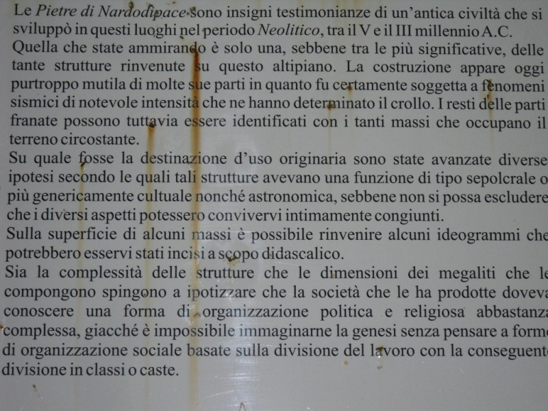 Su di essi sono state ritrovate incisioni e graffiti scolpiti con scalpello che si rifanno proprio al codice di scrittura decifrato sulle tavolette di Tolone Azzariti. Il prof. Guerricchio, grazie all’ausilio di fotografie aeree e stereoscopiche, nonché grazie ai rilevamenti di carattere magnetometrico ha potuto affermare la tesi secondo cui il sito di interesse archeologico sarebbe ben più vasto di quello visibile ad occhio nudo, basterebbe solo che le autorità competenti, finalmente, si decidessero a dare una svolta significativa nella ricostruzione del Neolitico calabrese. Senza voler entrare in polemica con alcuno, nella consapevolezza che ciò non gioverebbe alla ricerca, va segnalato che la Sovrintendenza ai beni culturali venne informata immediatamente del ritrovamento già nel 2002, dal sig. Vincenzo Nadile, segnalazione che però rimase inascoltata. Solo dopo i primi rilievi eseguiti dal pool di studiosi guidato da Guericchio , la Sovrintendenza della Calabria inviò sul luogo un “controllore geologico” (e non anche un archeologo) che lapidariamente concluse che i megaliti di Nardo di Pace altro non sono che dei “Tor” frutto dell’erosione degli agenti atmosferici.