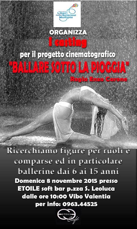 L’Associazione “Liberi nella sclerosi multipla”, con sede a Figline Vegliaturo (CS) promuove, in collaborazione con l’attore vibonese Costantino Comito, un progetto cinematografico di sensibilizzazione, dal titolo “Ballare sotto la pioggia”. Il sodalizio, presieduto da Assunta Mazzei, si avvale della magistrale collaborazione del regista Enzo Carone e dell’amato attore Costantino Comito, testimonial di “Liberi nella sclerosi multipla”. Costantino ha dimostrato in più di un’occasione di credere nell’operato dell’associazione e di volersi impegnare in prima persona nella diffusione e nella promozione dell’importanza della prevenzione, diagnosi precoce e cura della Sclerosi Multipla, cercando di dare un messaggio di speranza a chi è affetto da questa importante patologia. L’attore ha dimostrato inoltre di conoscere e apprezzare il valore della parola “volontariato” partecipando ad alcuni progetti di promozione dell’associazione, tra cui il cortometraggio “Presto”, diretto da Gianluca Sia, lo spot “Un Tulipano per la ricerca 2013” diretto da Maria Furfaro. Costantino Comito non ha richiesto alcun compenso e inoltre ha creato delle interessanti collaborazioni con altre associazioni che ci hanno aiutato e ci aiuteranno a diffondere le nostre idee. L’idea di questo nuovo progetto nasce proprio da un incontro con Costantino Comito, che come sempre ha sposato pienamente i progetti dell’associazione, è un testimonial presente, ma soprattutto attivo. Con lui e con il regista tropeano Enzo Carone, l’associazione “Liberi nella sclerosi multipla” porterà avanti questa nuova iniziativa che prevede innanzitutto lo svolgimento di una giornata di selezione per attori. Domenica 8 novembre alle ore 10.00, presso l’Etoile Softbar piazza S. Leoluca a Vibo Valentia, si svolgeranno i casting per il progetto cinematografico “Ballare sotto la pioggia”, con l’obiettivo di trovare figure per ruoli e comparse, in particolare ballerine dai 6 ai 15 anni.