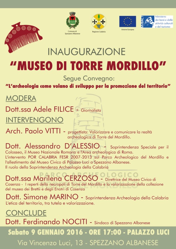 Sabato 9 gennaio 2016 alle ore 17.00 presso Palazzo Luci in Spezzano Albanese, si terrà l’incontro-dibattito per la presentazione del Parco Archeologico Torre del Mordillo. Saranno presenti il Sindaco Dott. Ferdinando Nociti, l’Arch. Paolo Vitti progettista e direttore dei lavori, il Dott. Alessandro D’Alessio della Soprintendenza Speciale per il Colosseo e l’area archeologica di Roma, la Dott.ssa Marilena Cerzoso direttrice del museo civico di Cosenza, il Dott. Simone Marino della Soprintendenza archeologia della Calabria. L’incontro sarà moderato dalla giornalista Dott.ssa Adele Filice. L’incontro-dibattito è stato organizzato dall’Amministrazione Comunale, a conclusione dei lavori di completamento del Parco Archeologico di Torre del Mordillo e dell’allestimento del Museo presso Palazzo Luci. I lavori sono stati finanziati dal POR Calabria 2007/13 Obiettivo operativo 5.2.1 per la realizzazione di interventi di valorizzazione e tutela dei beni culturali e si inseriscono in un più vasto progetto. Situato a circa un chilometro a valle della confluenza tra il fiume Esaro ed il Coscile, al centro dei rilievi che chiudono ad ovest la piana di Sibari, ad una distanza di due chilometri dal centro abitato di Spezzano Albanese, il pianoro di Torre del Mordillo rappresenta senza dubbio uno sei siti archeologici più importanti in Calabria, per quanto poco conosciuto a causa di una mancata azione di manutenzione, valorizzazione delle emergenze archeologiche. Con i lavori svolti, le strutture sono state rilevate, studiate, restaurate e valorizzate, restituendo finalmente una chiara visione del circuito difensivo, posto a protezione di un insediamento pre-romano che controllava le vie di passaggio da e per la Piana di Sibari. In questo programma è stato inserito anche il restauro della Torre medievale, l’antica Torre Mordillo, probabilmente di età normanna (XI sec. d.C.), alta poco più di 7 metri, che dà il nome al sito, colpita da fulmini e che presentava gravi lacune murarie e lesioni, divenuta un elemento di riferimento del paesaggio della Piana di Sibari. Il Parco Archeologico di Torre del Mordillo si snoda lungo alcuni sentieri che costeggiano il percorso della cinta muraria di età ellenistica, così da consentire sia la visione del paesaggio circostante sia la visione dei tratti ad oggi scavati. Lungo il percorso sono stati collocati nove pannelli che raccontano gli elementi significativi antichi del pianoro e del paesaggio circostante. L’area è stata dotata di un sistema di videosorveglianza e di illuminazione notturna della Torre e delle mura lungo il tratto settentrionale. Il Museo permanente (didattico) di Torre Mordillo è situato in pieno centro storico del Comune di Spezzano Albanese, ubicato nel Palazzo Luci. Allestito interamente da video didattici e pannelli illustrativi, si compone di cinque sale ognuna delle quali è pertinente a un periodo storico. Esso si pone ad integrazione del Museo Nazionale della Sibaritide e quello dei Bretti a Cosenza, con una finalità eminentemente didattica, resa possibile dal ricorso anche a plastici, ologrammi e filmati. Giuseppe Gazzarano Consigliere con delega al Turismo del Comune di Spezzano Albanese, dichiara – “Attraverso il patrimonio culturale di Torre del Mordillo si creano i presupposti per dar vita ad un percorso di marketing turistico – culturale e museale, tema estremamente importante per la creazione di valore economico e per lo sviluppo territoriale”. Il Sindaco di Spezzano Albanese, Ferdinando Nociti, ha espresso la sua soddisfazione per i lavori che sono stati realizzati ed ha dichiarato – “La cultura, il territorio e l’impresa sono elementi imprescindibili per la crescita turistica di un territorio. Inviteremo ad una visita tutte le scuole del territorio. Daremo seguito a progetti di ricerche archeologiche coinvolgendo le università interessate, attraverso cui realizzare campagne di scavi, favorendo loro l’accoglienza e tutto il necessario per mantenere vivo il Parco di Torre del Mordillo, anche attraverso il coinvolgimento delle imprese del territorio. Renderemo il Museo e Palazzo Luci centro multidisciplinare e polifunzionale, faremo il possibile affinchè diventino centro di incontri culturali, e di attrazione turistica”.
