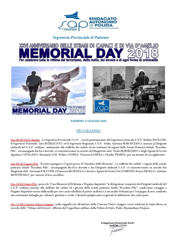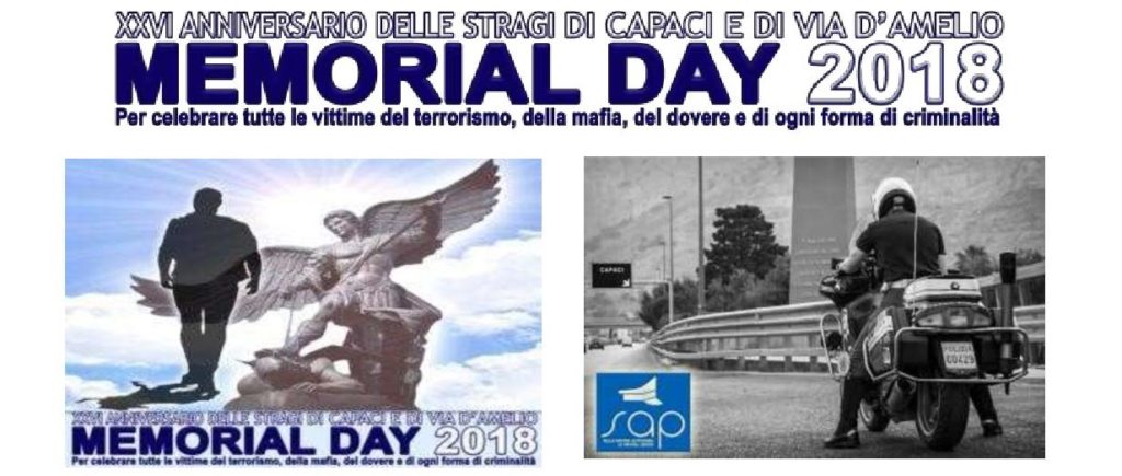 La Segreteria Provinciale del Sindacato Autonomo di Polizia, guidata dal Segretario Pietro Billitteri, nell’ambito dell’iniziativa nazionale in ricordo di tutte le vittime della “criminalità mafiosa, del terrorismo e della delinquenza in generale” denominata “Memorial Day 2018 il Cammino della Memoria” alla presenza del Segretario Generale S.A.P. Stefano Paoloni, del Segretario Regionale Sicilia Gaetano Maranzano e di tutti i Segretari Provinciale Provinciali dell’Isola, giorno 11 maggio 2018 renderà omaggio alle Vittime delle Strage di Capaci del 23 maggio e della strage di via D’Amelio del 19 luglio 1992, nonché, alla vittima di mafia Peppino Impastato, nella casa memoria di Cinisi (PA) nel 40° anniversario della sua morte. Partendo da Via D’Amelio i dirigenti sindacali del S.A.P., insieme ad un gruppo di ciclisti ed i ragazzi della Scuola Primaria Statale “Rosolino Pilo” di Palermo, accompagnati dai loro insegnati, dopo avere reso omaggio al Dott. “Paolo Borsellino” e gli Agenti di Scorta “Agostino Catalano, Emanuela Loi, Vincenzo Li Muli, Walter Cosina e Claudio Traina” intraprenderanno la “Staffetta della Memoria” recandosi prima a Capaci nel “Giardino della Memoria” per ricordare i Magistrati “Giovanni Falcone e Francesca Morvillo ” e gli Agenti di Scorta “Vito Schifani, Rocco Dicillo e Antonino Montinaro” per poi recarsi a Cinisi presso la Casa Memoria “Felicia e Peppino IMPASTATO” dove i ragazzi, verranno accompagnati dai volontari, lungo il percorso didattico “I cento passi”. Il “Memorial Day”, nato nel 1993 dopo la strage di Capaci, ha come scopo quello di far comprendere alle generazioni future che la violenza “mafiosa e criminale di qualsiasi genere”, non può avere spazio nella società civile, poiché come diceva Giovanni Falcone “gli uomini passano, le idee restano e continueranno a camminare sulle gambe di altri uomini”. A partire dal 2016 abbiamo però pensato di estendere la finalità dell’iniziativa, oltre al valore della memoria, anche a quelli della “verità” e della “giustizia”. Da qui è nato il “Cammino della Memoria, della Verità e della Giustizia”, giunto quest’anno alla terza edizione. La “Giornata della Memoria” palermitana si concluderà nella Caserma Pietro Lungaro all’interno della Cappella, dove sarà celebrata la Santa Messa in ricordo delle “Vittime del Dovere” officiata dal Cappellano Militare della Polizia di Stato, Padre Massimiliano PURPURA. La manifestazione nazionale, del Cammino della Memoria della Verità e della Giustizia, si concluderà con il concentramento di tutti i dirigenti sindacali delle strutture del Sindacato Autonomo di Polizia di tutta Italia, a Monte Sant’Angelo (FG) nella giornata del 19 maggio.