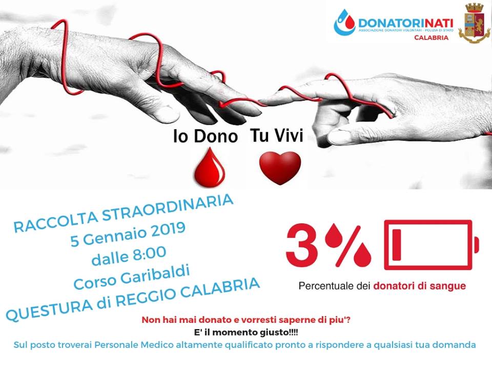 “Emergenza sangue a Reggio Calabria. Rispondiamo al grande appello del Primario del Centro Trasfusionale del Grande Ospedale Metropolitano “Bianchi- Melacrino- Morelli” Dottor Alfonso Trimarchi, il quale afferma che la situazione delle riserve di sangue è veramente critica. Le donazioni sono in calo e le scorte di sangue ormai finite, tant’è che sono stati bloccati tutti quegli interventi cosiddetti in “elevazione” cioè programmati, al fine di riservare le scorte “ormai esigue”, solo per le urgenze. “Invito la citta’ a farsi un esame di coscienza”, afferma il Dottor Trimarchi, altrimenti la città “Muore”, l’Ospedale muore, rischiando di non riuscire a garantire il supporto trasfusionale neanche ai pazienti oncomatologici. La donazione del sangue, non deve essere solo un atto d’amore, ma anche un senso civico, uno stile di vita che contribuisce all’assetto della società“, è quanto scrive in una nota Giuseppe Presto, presidente Donatorinati Calabria. “Donatori Nati Calabria, l’Associazione Donatori e Volontari della Polizia di Stato -prosegue la nota- ha organizzato non solo una raccolta straordinaria di Sangue ma anche un punto di informazione e divulgazione della cultura della donazione. Puoi donare giorno 5 Gennaio sull’autoemoteca davanti alla Questura di Reggio Calabria lato Corso Garibaldi. Ad attenderti ci sarà personale altamente qualificato, quali medici esperti nel settore, pronti a rispondere a qualsiasi domanda, anche per la “tua prima donazione”. Per tutta la giornata inoltre, troverai personale volontario che ti illustrerà il programma e requisiti del donatore, le finalità e l’importanza del grande gesto di altruismo”, conclude.