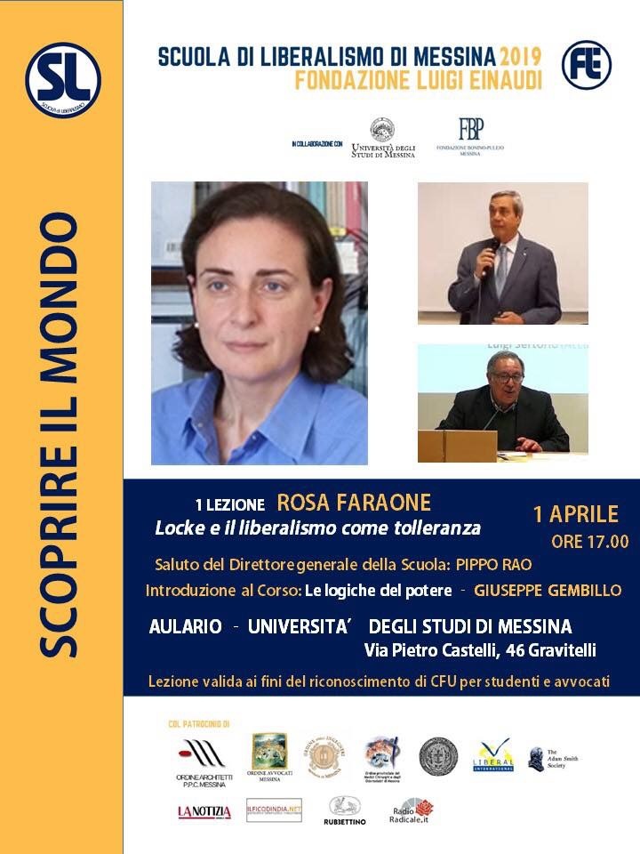 Lunedì 1° aprile alle ore 17.00, presso l’Aulario dell’Università degli Studi di Messina (sito in via Pietro Castelli 46, Gravitelli), avrà ufficialmente inizio il nuovo corso della “Scuola di Liberalismo” di Messina, promosso dalla Fondazione Luigi Einaudi e quest’anno giunta alla nona edizione. Dopo il saluto del Direttore generale della Scuola, Prof. Pippo Rao, e dell’Avv. Enzo Palumbo, membro della Commissione Giustizia della Fondazione Einaudi, il Direttore scientifico della Scuola, Prof. Giuseppe Gembillo, introdurrà il Corso con un intervento su “Le logiche del potere”. Seguirà, subito dopo, la lezione della Prof.ssa Rosa Faraone sul tema “Locke e il liberalismo come tolleranza”. Nell’occasione sarà possibile effettuare l’iscrizione al corso; si ricorda, inoltre, che la partecipazione all’incontro è valida ai fini del riconoscimento di crediti formativi per studenti universitari e per avvocati.