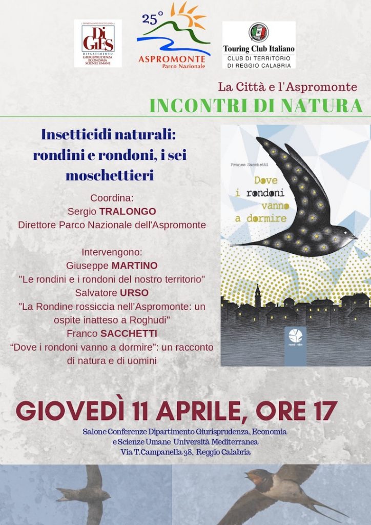 Secondo appuntamento con gli “Incontri di Natura” questa settimana a Reggio Calabria: giovedì 11 aprile il ciclo di conferenze organizzate dall’Ente Parco Nazionale dell’Aspromonte, insieme al Touring Club Italiano, Club di Territorio di Reggio Calabria, e al Dipartimento di Giurisprudenza, Economia e Scienze Umane dell’Università Mediterranea, affronta il tema degli “insetticidi naturali”, ovvero gli uccelli insettivori, tanto utili per l’uomo, quanto pericolosamente in diminuzione a causa delle alterazioni ambientali. Rondini e rondoni, che tradizionalmente annunciano con la loro presenza l’arrivo della bella stagione, diventeranno i protagonisti di un viaggio nell’affascinante mondo dell’avifauna: le loro caratteristiche, spesso sconosciute al grande pubblico, le loro abitudini alimentari, tanto importanti per la nostra salute, e i loro problemi di sopravvivenza, in un mondo sempre più aggredito dalle attività umane, saranno al centro dell’incontro, al quale parteciperanno, in qualità di relatori, Giuseppe Martino e Salvatore Urso, ornitologi e collaboratori del Parco. “Gli esperti – sottolinea il direttore Sergio Tralongo – presenteranno queste specie che tutti probabilmente credono di conoscere, ma che in realtà offrono interessanti spunti di approfondimento. Chi sa, infatti, che il nostro Parco ospita ben sei specie, tutte di interesse conservazionistico e particolarmente protette, e che una di queste, in particolare, è presente da noi con uno dei maggiori nuclei riproduttivi di tutta Italia? La comunicazione corretta in campo naturalistico è fondamentale, e proprio per questo il Parco dell’Aspromonte vuole presentarsi alla città e al grande pubblico con queste iniziative, che ci auguriamo abbiano grande seguito”. Ma il programma non si esaurisce qui: il Parco dell’Aspromonte è infatti lieto di ospitare l’Autore di un originalissimo testo, appena pubblicato, che affronta con rigore scientifico e toni divulgativi proprio l’argomento della serata. “Dove i rondoni vanno a dormire” è un bellissimo racconto a fumetti, adatto a tutte le età, con il quale Franco Sacchetti, un illustratore abruzzese particolarmente sensibile ai temi ambientali, ha costruito una storia di natura e di uomini, di biologia e di conservazione, di attivismo e di gestione del territorio. Appuntamento dunque giovedì 11 aprile, presso il salone delle Conferenze del Dipartimento di Giurisprudenza, Economia e Scienze Umane dell’Università Mediterranea, in via Campanella 38 a Reggio Calabria, con inizio alle 17. La partecipazione agli “Incontri di Natura” è gratuita.