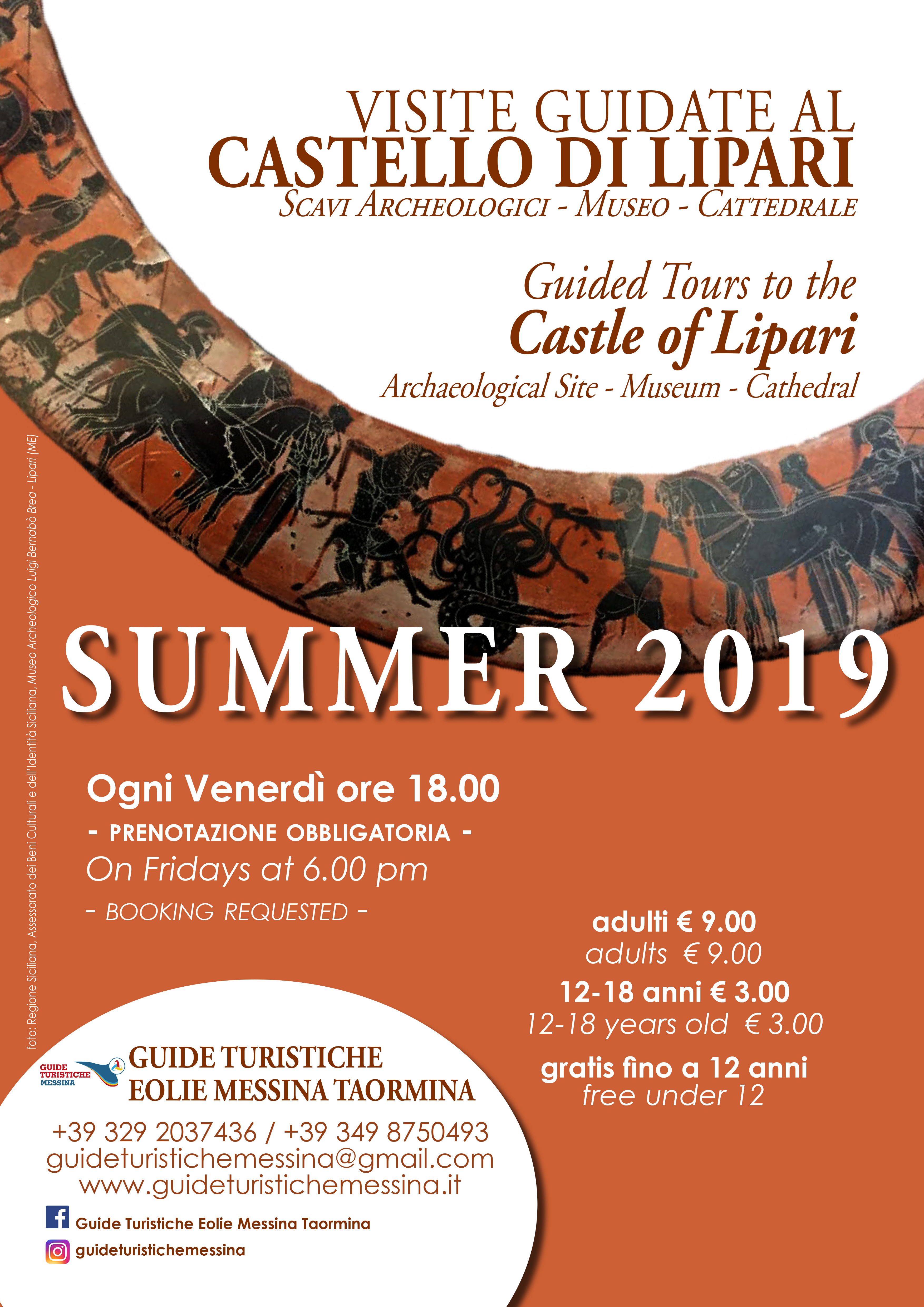 Ogni venerdì alle ore 18.00 le guide turistiche abilitate dell’Associazione effettueranno una visita guidata con partenza dall’ingresso principale del Castello di Lipari (Piazza Mazzini). I tour cominciano venerdì 12 Luglio 2019, alle ore 18.00.
