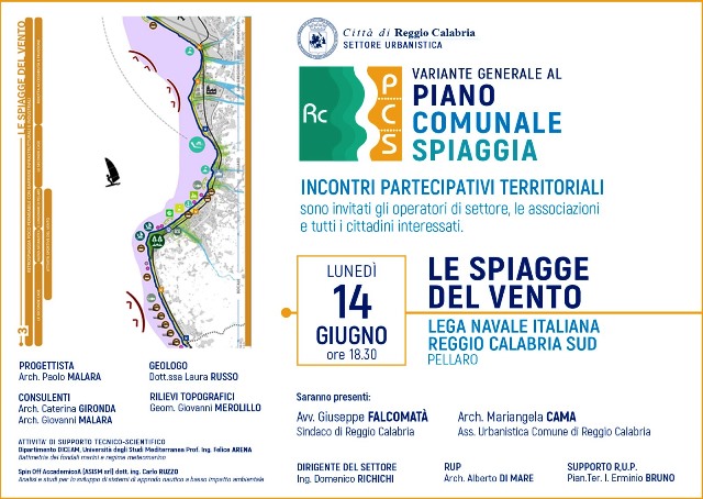 È in programma lunedì 14 giugno la seconda tappa del nuovo ciclo di incontri partecipativi territoriali sul Piano Spiaggia Comunale. Il percorso avviato dall’amministrazione comunale sta coinvolgendo i diversi interlocutori del territorio con l’obiettivo di raccogliere input e proposte utili a rafforzare la nuova strategia di governance del litorale cittadino contenuta in quello che ormai viene considerato un vero e proprio Masterplan del mare. Il secondo appuntamento accenderà i riflettori sulla zona sud, “Le spiagge del vento”, nell’ambito di un incontro che si svolgerà alle ore 18.30 alla Lega Navale Italiana Reggio Calabria Sud alla presenza del Sindaco di Reggio Calabria, Giuseppe Falcomatà, dell’assessora comunale all’Urbanistica, Mariangela Cama, del dirigente di settore, ing. Domenico Richichi, del rup, arch. Alberto Di Mare, del supporto rup, Erminio Bruno, del progettista, arch. Paolo Malara, del geologo, dott.ssa Laura Russo, dei consulenti, arch. Caterina Gironda e arch. Giovanni Malara, del responsabile rilievi topografici, geom. Giovanni Merolillo, del prof. Felice Arena dell’Università “Mediterranea” e dell’ing. Carlo Ruzzo Spin Off Accademico Asism Srl. All’iniziativa, sono invitati a partecipare gli operatori di settore, le associazioni e i cittadini.