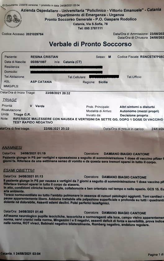 “Ciao a tutti, vi racconto la mia storia sperando possiate passare voce. Ho 24 anni, sono di Catania (avevate pubblicato pure un articolo, in anonimo, su di me) e mi sono vaccinato il 16 agosto con Pfizer, prima del vaccino ho fatto tutte le analisi esistenti ed erano perfette, come immaginavo visto che non ho mai avuto problemi di salute. Dalla sera di allora è cominciato un calvario dalla quale ne sto uscendo solo oggi, si spera: vertigini e senso di sbandamento quando cammino praticamente h24, senso di stordimento come se fossi ubriaco anche esso h24, stanchezza immensa al minimo sforzo (15 giorni prima mi allenavo in palestra con 40 gradi).Inizialmente venivo invitato dal medico di famiglia a non fare approfondimenti in quanto fosse ansia e a suo avviso dovevo fare seconda dose. Stando male chiamo all’hub vaccinale, loro stessi si rifiutano di farmi la seconda dose dopo quello che stavo ancora avendo. Stando ancora male approfondisco il tutto tramite specialisti e risonanze magnetiche: ho speso in totale oltre 600 euro per curarmi e sentirmi dire che fosse ansia. La risonanza magnetica ha poi evidenziato forti stati infiammatori alla cervicale e i medici da allora mi stanno prendendo sul serio e pian piano ne sto venendo fuori, dopo 50 giorni. Ho messo in standby la mia vita, infatti non sto ancora potendo riandare all’università, tra l’altro dopo tutto quello che ho passato e dopo che loro non mi hanno voluto fare seconda dose non ho ancora il green pass. Ho dovuto creare un gruppo su WhatsApp di incontro con altri vaccinati in giro per l’italia per confrontarci sul problema e aiutarci. Siamo abbandonati dalla sanità. Veniamo etichettati come ansiosi. Nessuno ci aiuta e dopo quella puntura molti di noi stanno venendo un incubo e in tv continuano a parlare di no vax pentiti. Chiedo che questa cosa possa fare il giro, autorizzando a mettere il mio nome e cognome e anche foto e far aprire gli occhi a questi cialtroni”.
