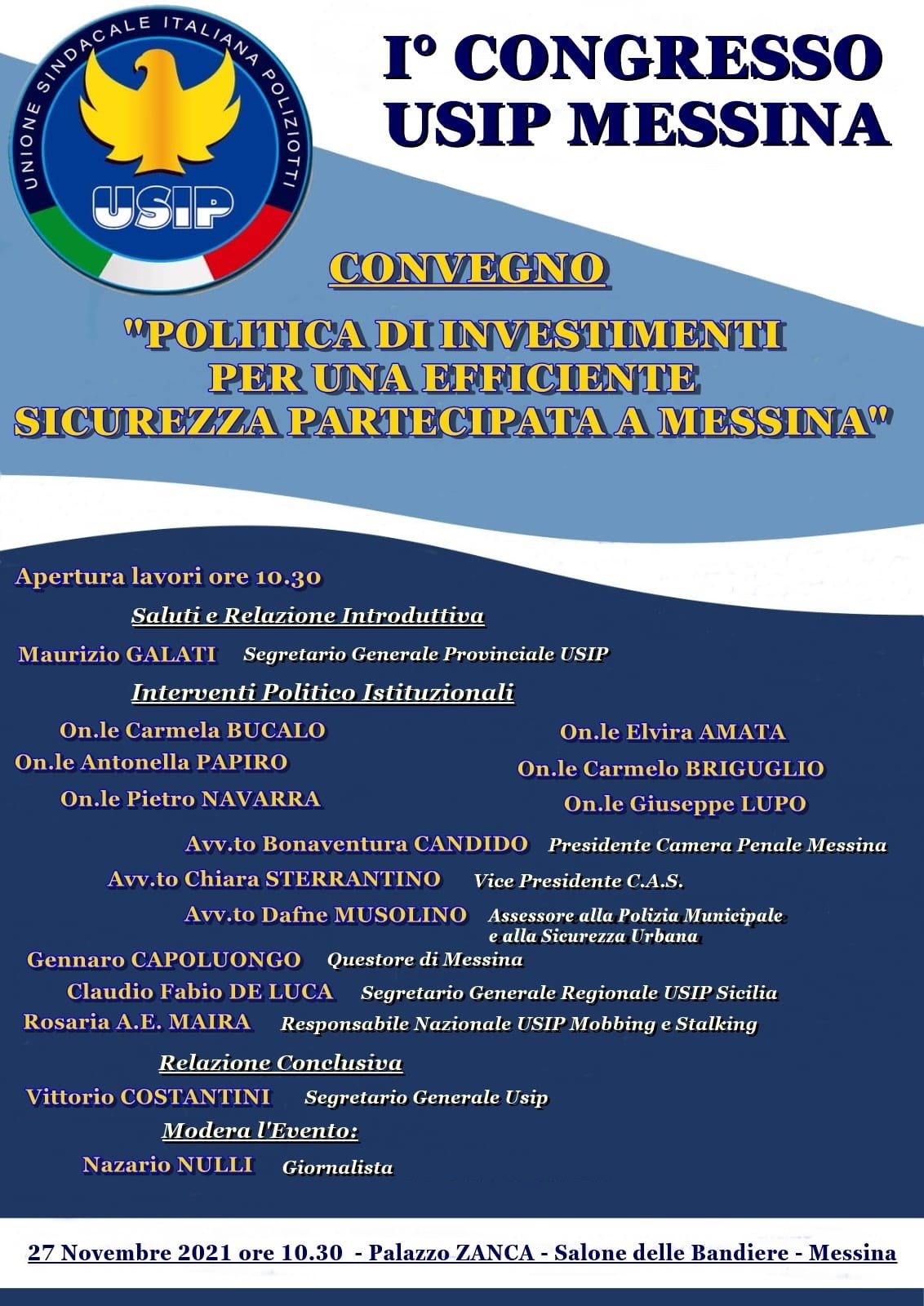 Sicurezza pubblica locale, investimenti per la creazione di servizi sempre più a misura di cittadino. Saranno questi i temi al centro di “Politica di investimenti per un efficiente sicurezza partecipata a Messina”, il convegno organizzato da USIP (Unione Sindacale Italiana Poliziotti) di Messina, in programma sabato 27 Novembre, dalle ore 10.30, nel Salone delle Bandiere a Palazzo Zanca, alla presenza del Segretario Generale USIP Vittorio Costantini e del Questore di Messina Dott. Gennaro Capoluongo.