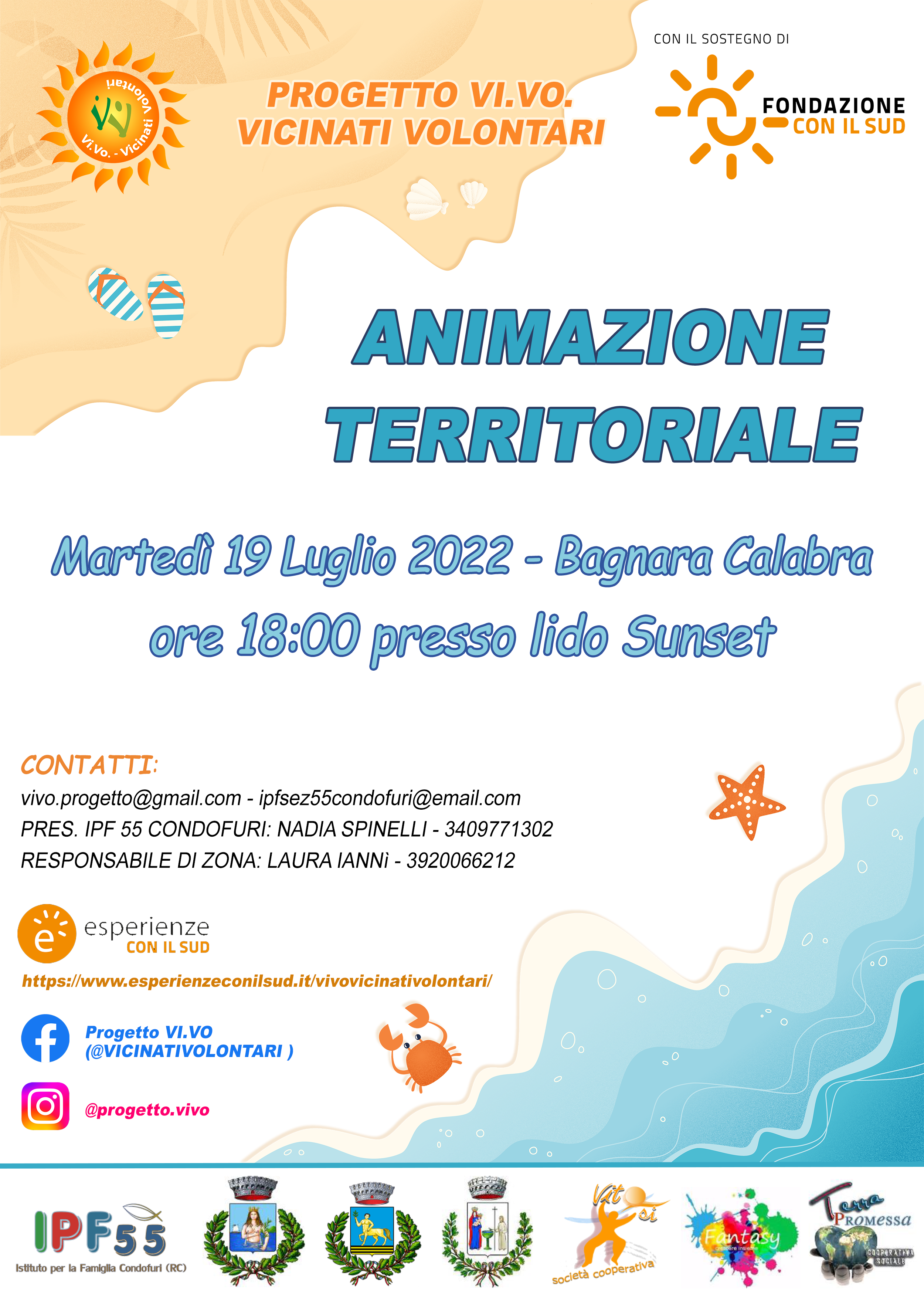 Il volontariato non va “in vacanza” ma approfitta di giornate di festa e condivisione, come quella di martedì 19 luglio, per raggiungere e sensibilizzare maggiormente le persone e farle avvicinare al mondo del volontariato. Continua infatti la campagna di eventi di animazione territoriale in seno al progetto “VI.VO.”- VICINATI VOLONTARI sostenuto dalla Fondazione CON IL SUD”, capofila l’Istituto per la Famiglia sez. 55 Condofuri (RC). I volontari ispirati dallo slogan del progetto “ILLUMINA LA TUA VITA, DIVENTA VOLONTARIO” si propongono a rallegrare e rinfrescare con musica e animazione la calda serata di martedì 19 luglio.