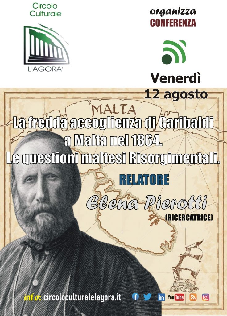 Il prossimo 12 agosto sulle varie piattaforme Social Network presenti nella rete, sarà disponibile la conversazione, organizzata dal Circolo Culturale “L’Agorà”, sul tema “La fredda accoglienza di Garibaldi a Malta nel 1864. Le questioni maltesi Risorgimentali”. L’eroe dei due Mondi giunse a Malta a bordo del vapore “Valletta”, accompagnato dai due figli Ricciotti e Menotti. Era la notte del 23 marzo 1864, ad accoglierlo nel porto dell’isola del centro del Mediterraneo c’era la baronessa Testaferrata Abela, una nobildonna maltese che voleva dare il benvenuto al generale a nome di tutti i maltesi. Pare che il messaggio di saluto con cui la baronessa si presentò fosse firmato da qualche centinaio di maltesi, ma l’arrivo dell’eroe dei due mondi suscitò a Malta sentimenti controversi, e non necessariamente di grande e positiva accoglienza.