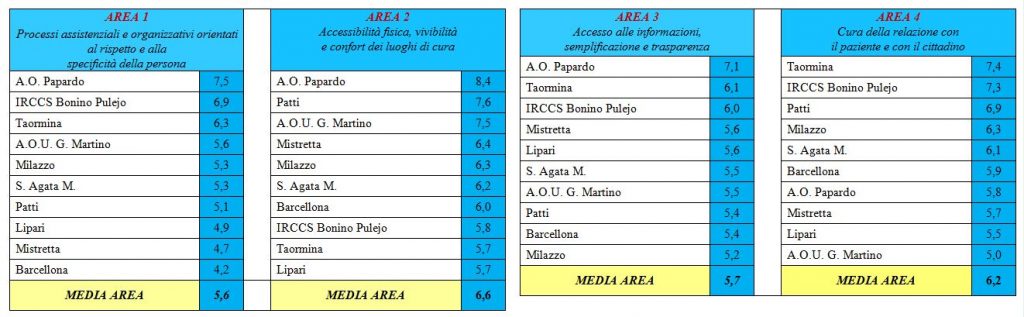 L’ospedale Papardo nella provincia di Messina si piazza all’apice del punteggio medio complessivo (vedi) delle aree di valutazione comparata, essendo al primo posto assoluto in tre delle quattro macro aree (vedi sotto):