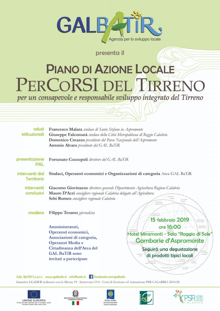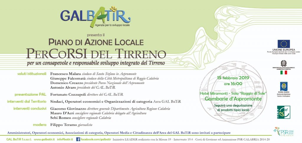 Il GAL BaTiR – Basso Tirreno Reggino – presenterà il Piano di Azione Locale 2014-2020 “PerCoRSi… del Tirreno, per un Consapevole e Responsabile Sviluppo Integrato” – venerdì 15 febbraio 2019, alle ore 16:00, presso la Sala “Raggio di Sole” dell’Hotel Miramonti a Gambarie d’Aspromonte. All’incontro per i saluti istituzionali interverranno, Antonio Alvaro, presidente GALBaTiR; Francesco Malara, sindaco di Santo Stefano in Aspromonte; Giuseppe Falcomatà, sindaco della Città Metropolitana di Reggio Calabria; Domenico Creazzo, presidente dell’Ente Parco Nazionale dell’Aspromonte. La presentazione delle linee guida del Piano di Azione Locale sarà esposta da Fortunato Cozzupoli, direttore del GAL BaTiR, a cui seguiranno gli interventi dal territorio di Sindaci, Operatori economici e Organizzazioni di categoria dell’area di riferimento del GAL BaTiR. I lavori, moderati dal giornalista Filippo Teramo, si concluderanno con gli interventi previsti di Giacomo Giovinazzo, direttore generale Dipartimento Agricoltura Regione Calabria; Mauro D’Acri, consigliere regionale Calabria delegato all’Agricoltura e Sebi Romeo, consigliere regionale Calabria. Il PAL 2014-2020 vedrà le misure e gli interventi subordinati ai tre Ambiti Tematici prescelti, ossia: lo sviluppo e l’innovazione delle filiere e dei sistemi produttivi locali (agroalimentari, artigianali e manifatturieri); il turismo sostenibile; la valorizzazione e gestione delle risorse ambientali e naturali. Inoltre, i tre Ambiti saranno gestiti in modo integrato ed il tema del turismo sostenibile rappresenterà un elemento innovativo, nonché uno strumento importante per lo sviluppo dell’area di riferimento. Gli interventi sul territorio riguarderanno, in particolare: il trasferimento di conoscenze e azioni di informazione attraverso la formazione; i regimi di qualità dei prodotti agricoli e alimentari riferiti ai prodotti delle filiere corte; gli investimenti in immobilizzazioni materiali, come ad esempio le microfiliere; lo sviluppo delle aziende agricole e delle imprese; i servizi di base e rinnovamento dei villaggi nelle zone rurali; la realizzazione di un Centro Internazionale per il Turismo Rurale destinato a promuovere la cultura dell’accoglienza e naturalmente la realizzazione di attività di cooperazione interterritoriale e transnazionale. A fine lavori sarà offerta una degustazione di prodotti tipici locali espressione del territorio. Amministratori, Operatori economici, Associazioni di categoria, Operatori Media e Cittadinanza dell’Area del GAL BaTir sono invitati a partecipare.