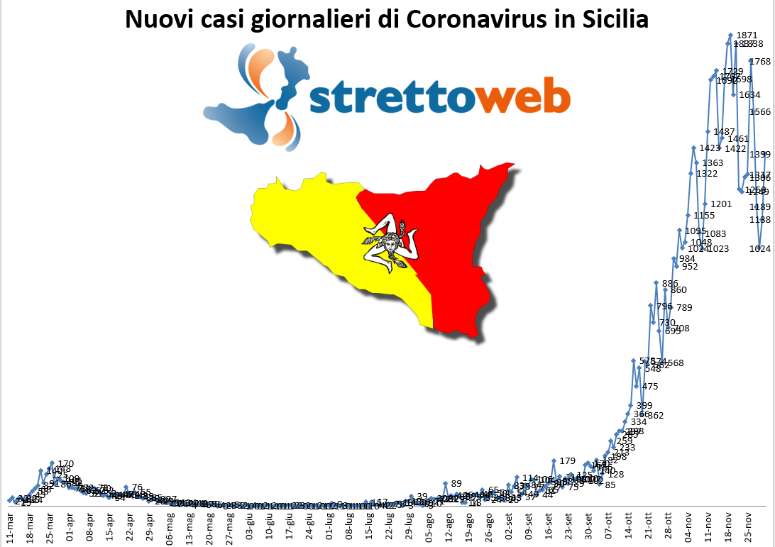 Oggi, 1 dicembre, in Sicilia ci sono stati 34 morti, 1.259 guariti e 1.399 nuovi casi positivi al Coronavirus su 10.733 persone sottoposte a tampone. Nelle ultime 24 ore in Sicilia è risultato positivo il 13,03% dei soggetti sottoposti a test. Secondo quanto riporta il bollettino ufficiale fornito dalla Regione, i nuovi casi rilevati oggi sono così suddivisi: