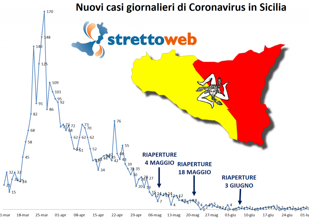 Questo il quadro riepilogativo della situazione in Sicilia, oggi 1 Luglio e aggiornato alle ore 17 di oggi, in merito all’emergenza Coronavirus. Dall’inizio dei controlli, i tamponi effettuati sono stati 211.496, su 172.497 persone: di queste sono risultate positive 3.081 (+1), mentre attualmente sono ancora contagiate 126, 2.673 (+3) sono guarite e 282 decedute (0). Degli attuali 126 positivi, 18 (-1) pazienti sono ricoverati – di cui 3 in terapia intensiva – mentre 105 (-1) sono in isolamento domiciliare.