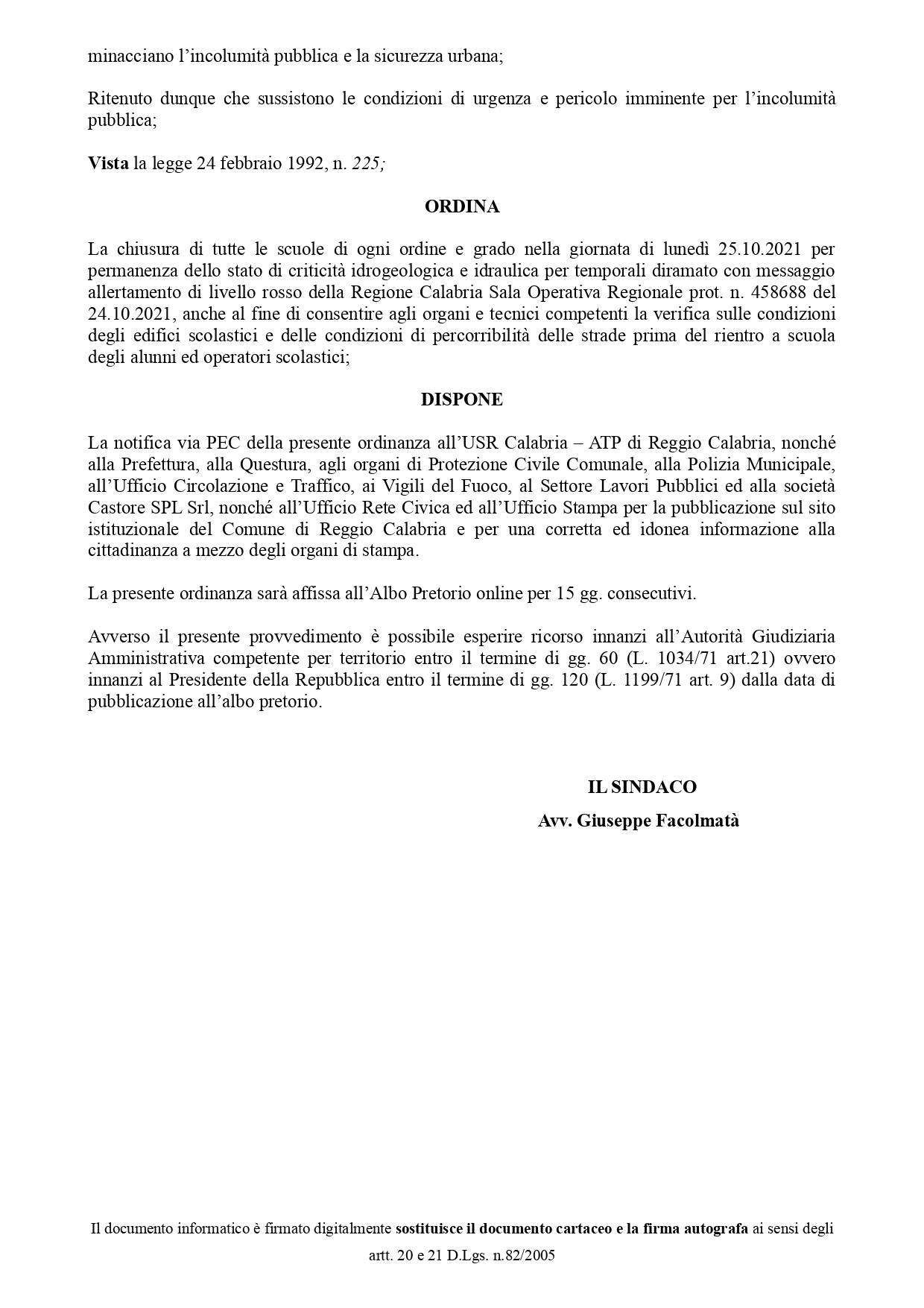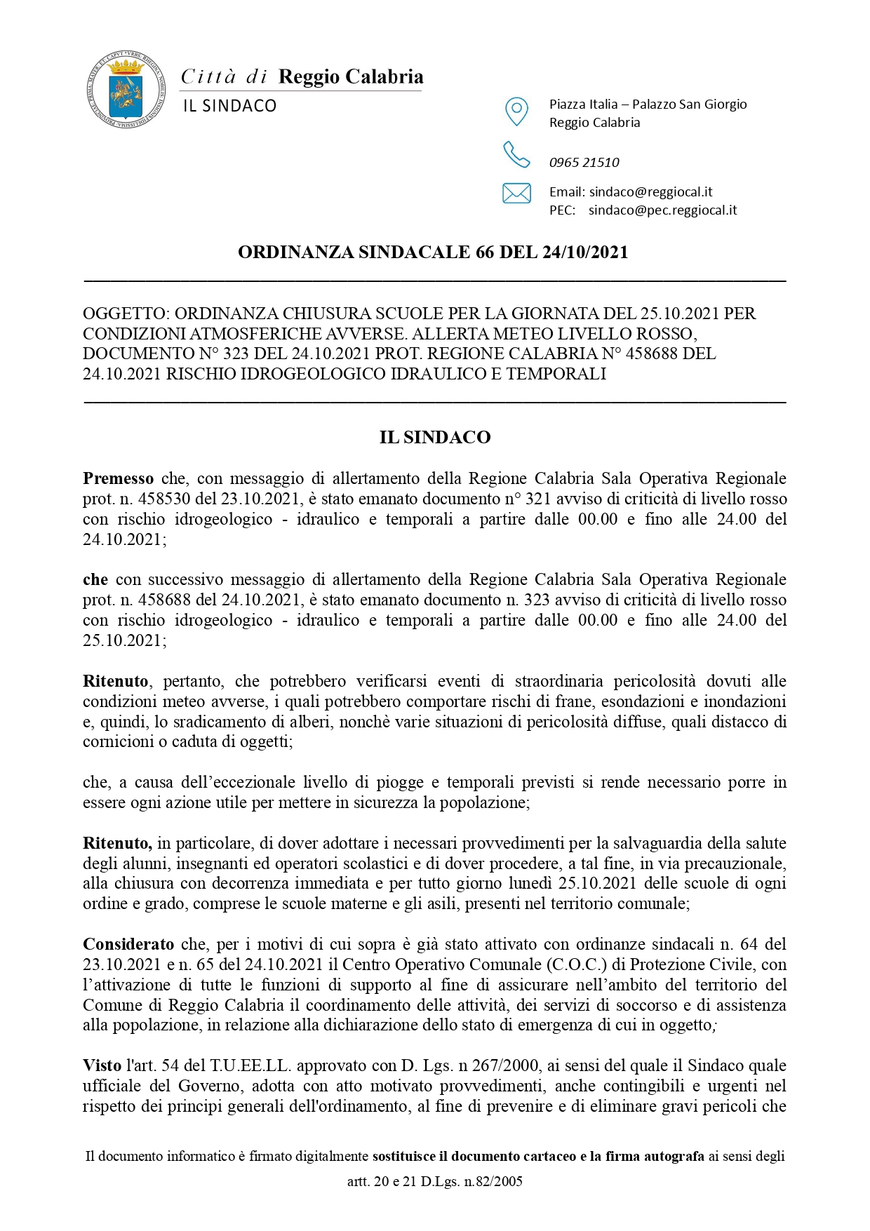 Anche a Reggio Calabria domani, lunedì 25 ottobre 2021, le scuole rimarranno chiuse per allerta meteo. Lo ha deciso il sindaco Falcomatà che proprio in questi minuti sta firmando l’apposita ordinanza, dopo che nel corso del pomeriggio l’avevano preceduto tutti i suoi omologhi di tutti gli altri principali comuni della provincia, da Palmi a Locri, da Polistena a Siderno, da Taurianova a Bovalino e Roccella. Scuole chiuse nella dirimpettaia Sicilia anche a Catania, Siracusa, Acireale, Augusta, Milazzo, Taormina e altri centri.