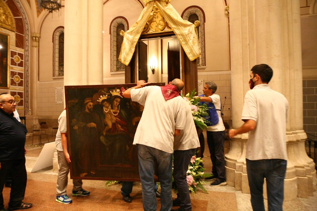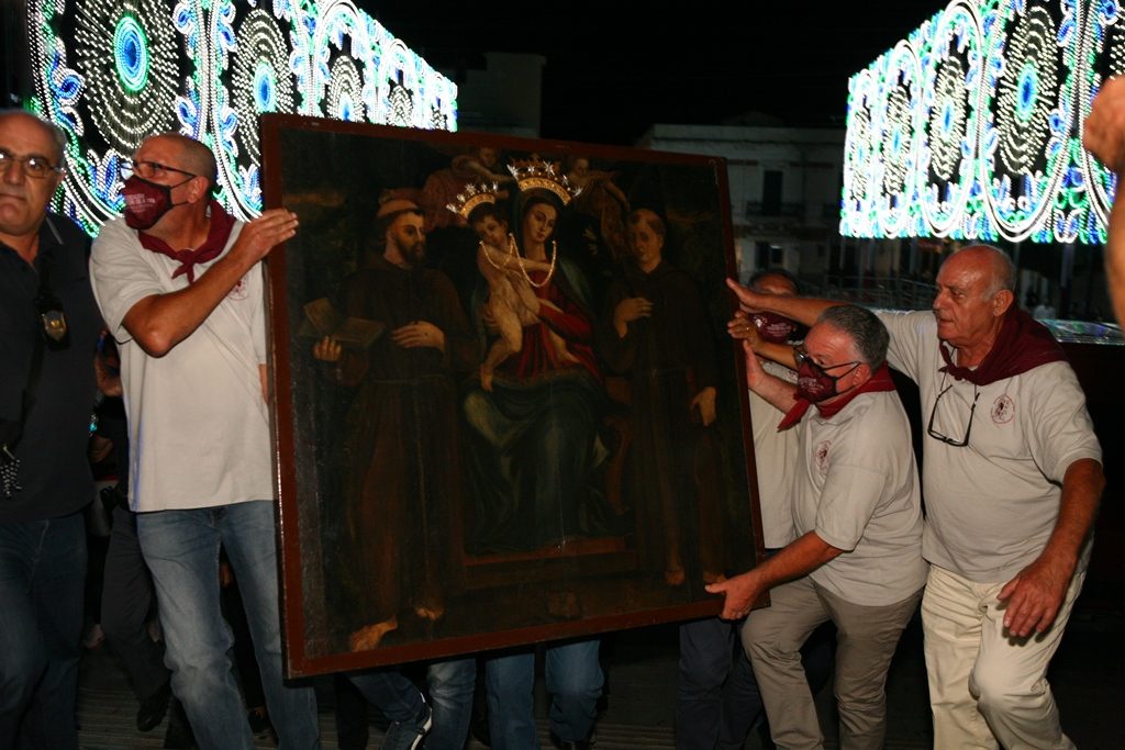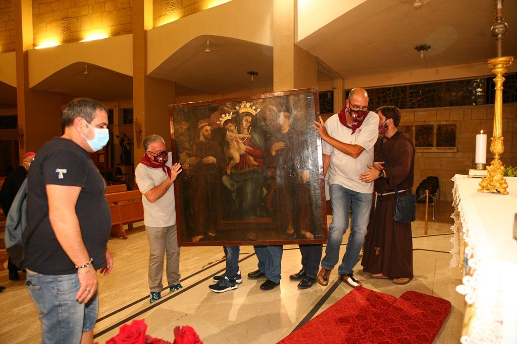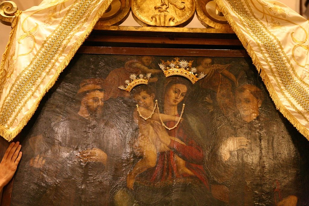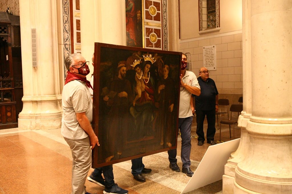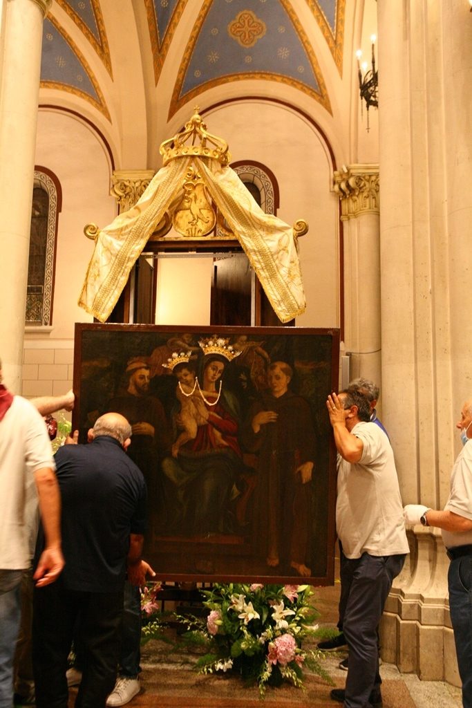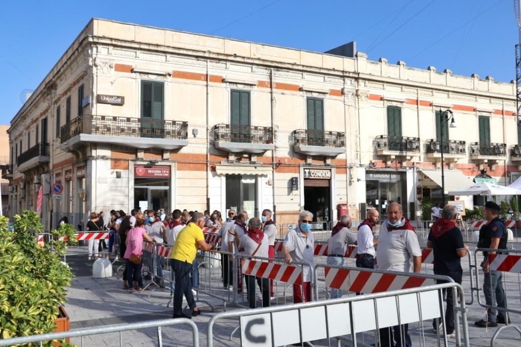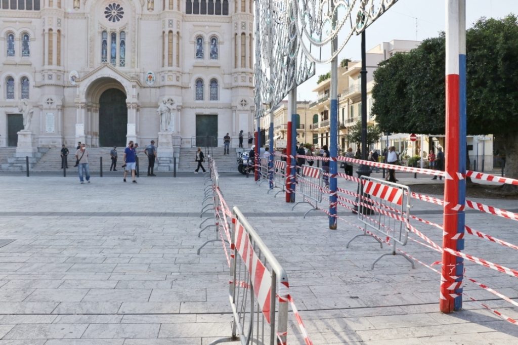 Adesso il quadro della Madonna – per la prima volta dopo il restauro – è esposto al Duomo. La il portone della chiesa è chiuso, la piazza è off-limits con un lunghissimo cordone di transenne per una coda che neanche agli Uffizi di Firenze. La piazza è letteralmente militarizzata: chiusi tutti i varchi, controlli stringenti. Il tutto per evitare folle e assembramenti.