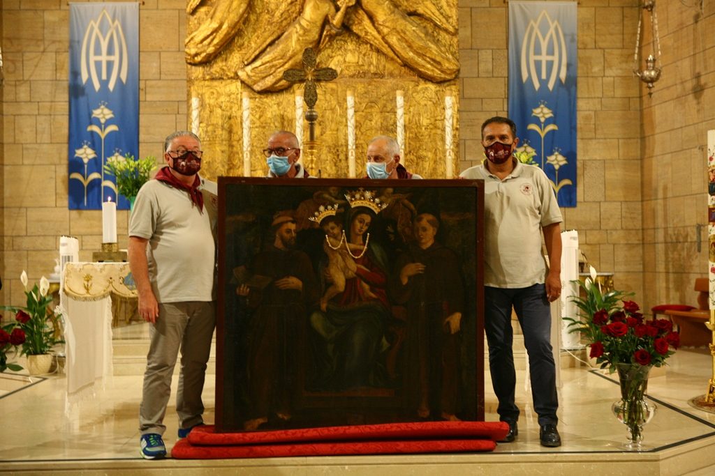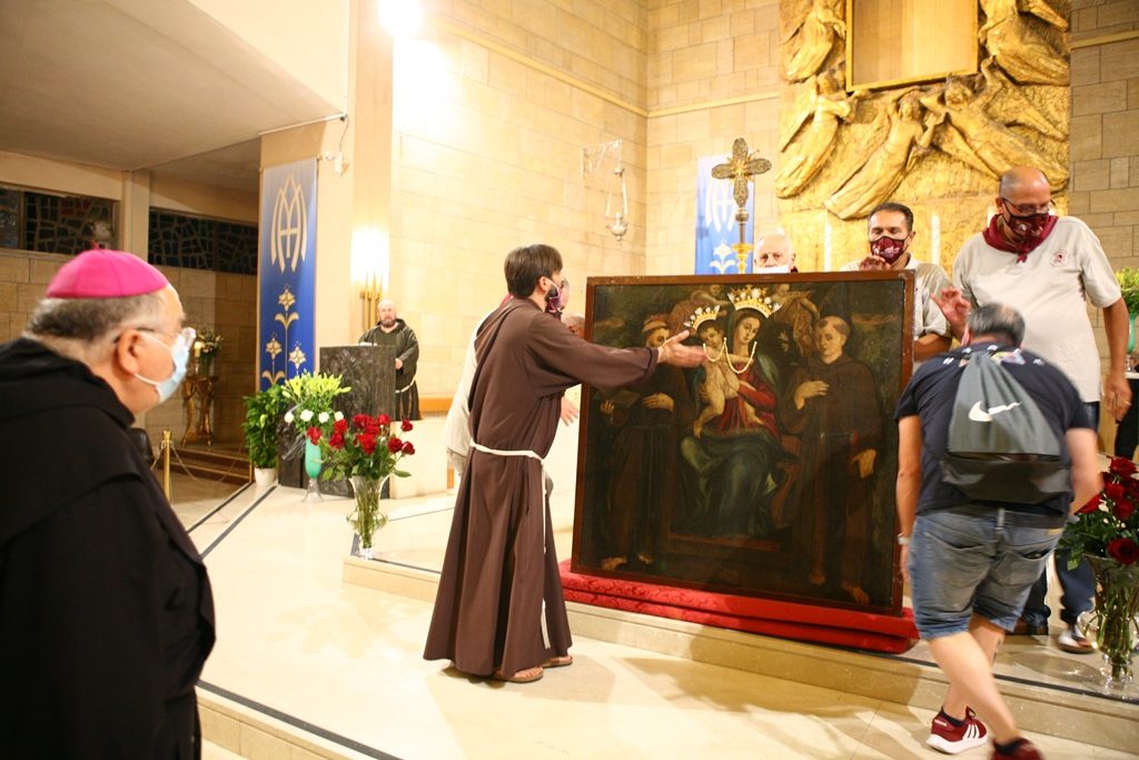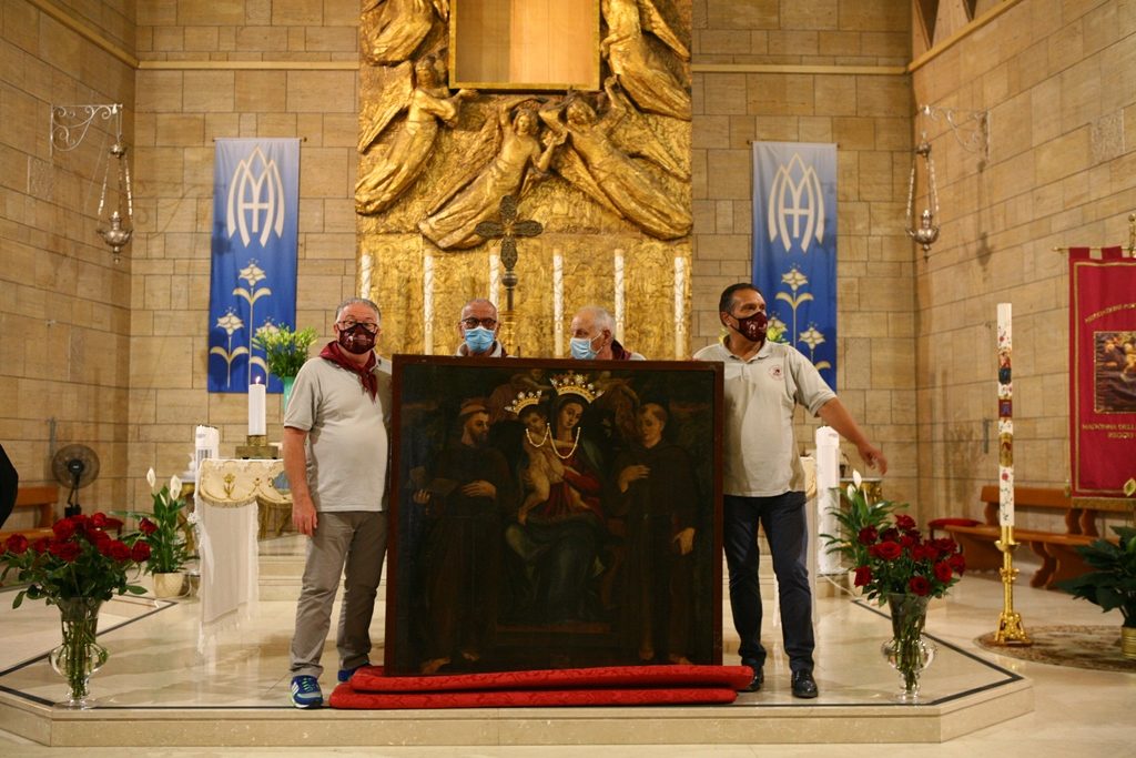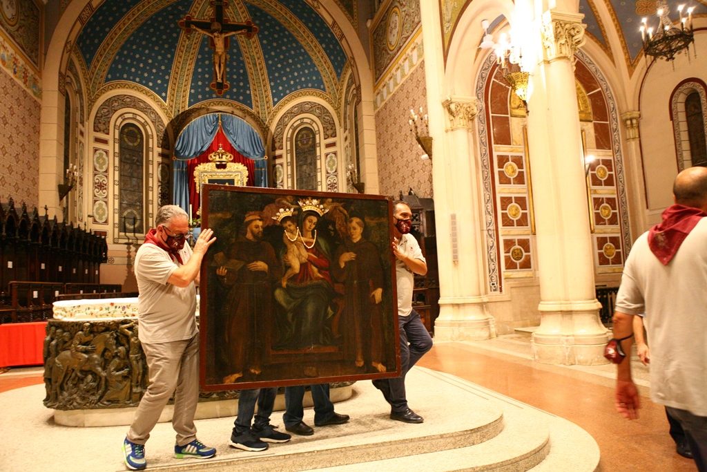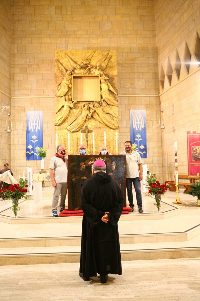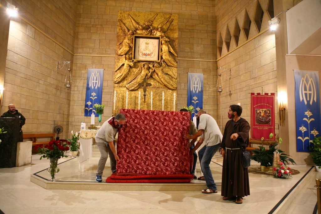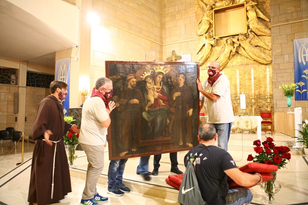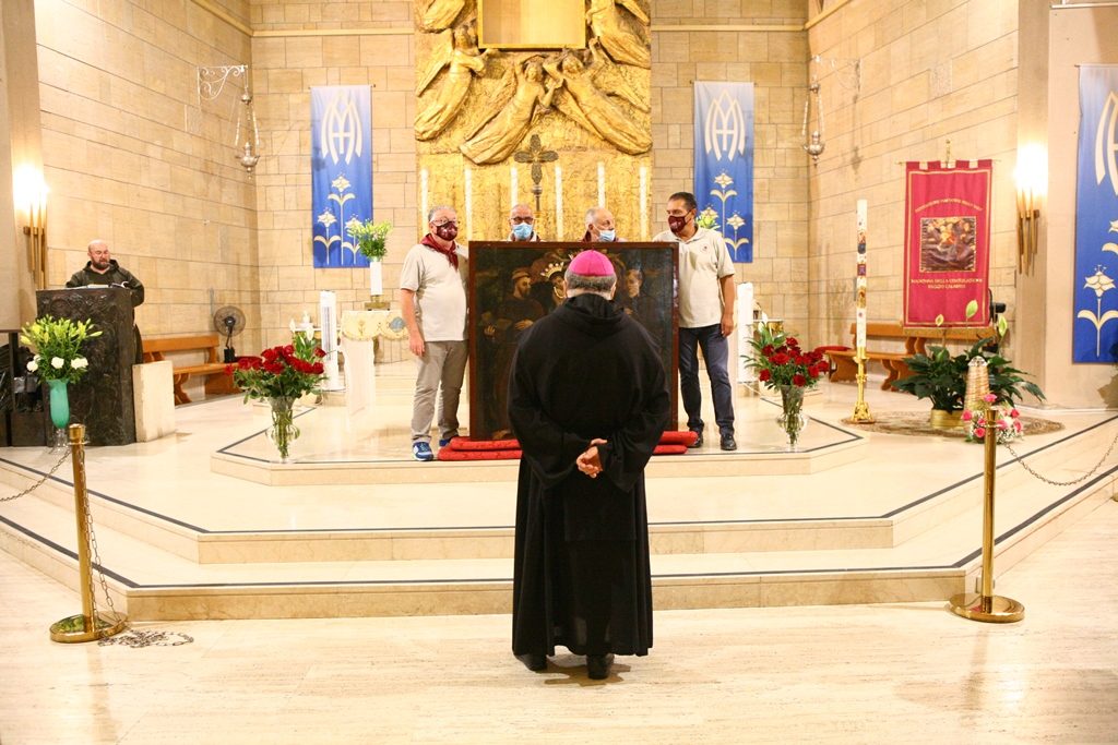 Adesso il quadro della Madonna – per la prima volta dopo il restauro – è esposto al Duomo. La il portone della chiesa è chiuso, la piazza è off-limits con un lunghissimo cordone di transenne per una coda che neanche agli Uffizi di Firenze. La piazza è letteralmente militarizzata: chiusi tutti i varchi, controlli stringenti. Il tutto per evitare folle e assembramenti.