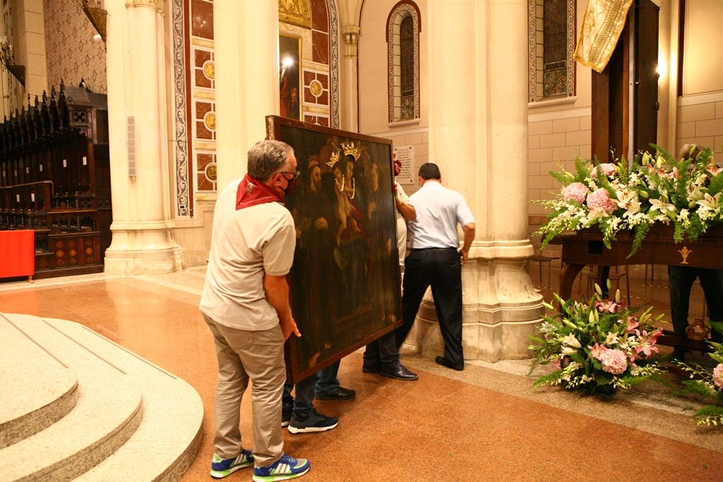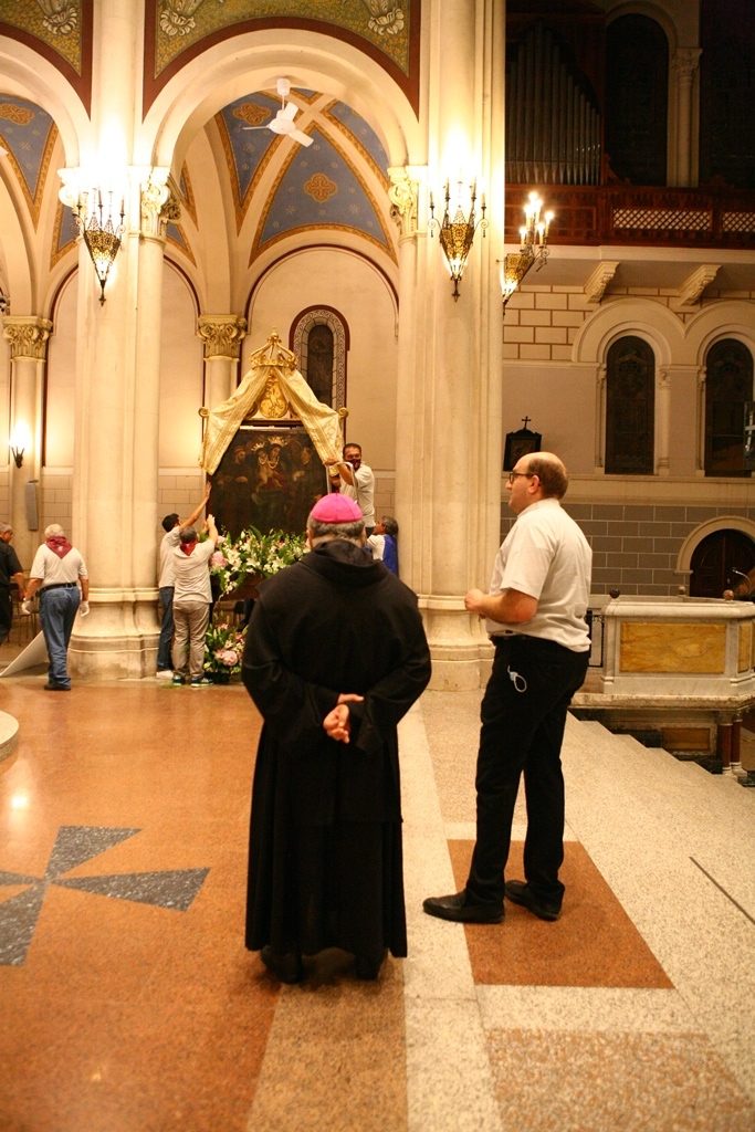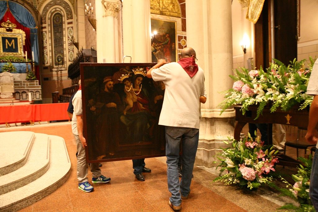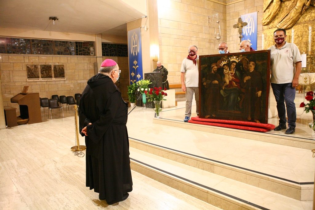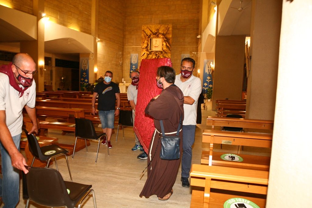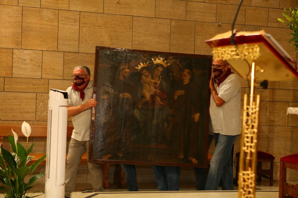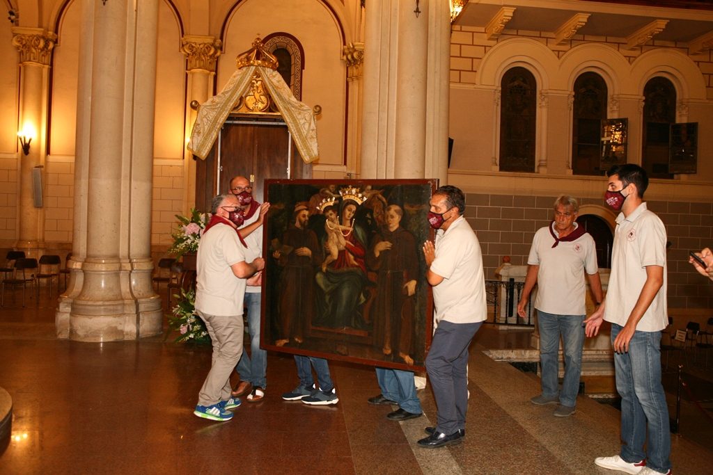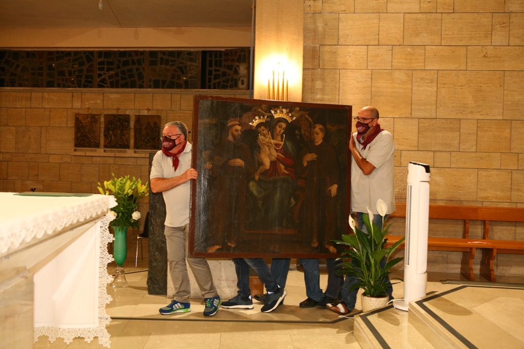 Adesso il quadro della Madonna – per la prima volta dopo il restauro – è esposto al Duomo. La il portone della chiesa è chiuso, la piazza è off-limits con un lunghissimo cordone di transenne per una coda che neanche agli Uffizi di Firenze. La piazza è letteralmente militarizzata: chiusi tutti i varchi, controlli stringenti. Il tutto per evitare folle e assembramenti.