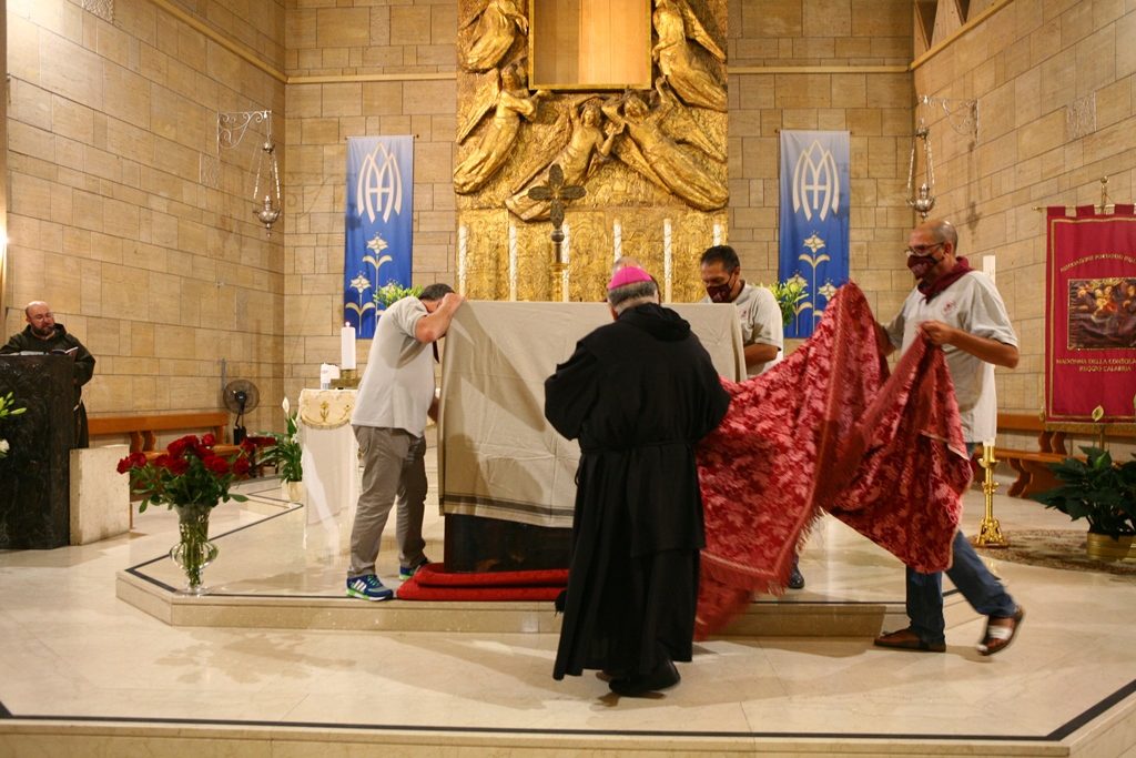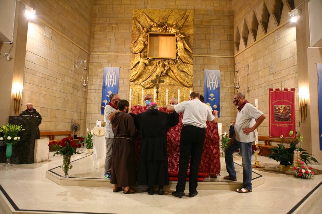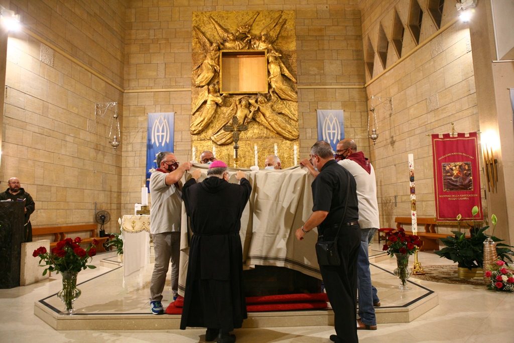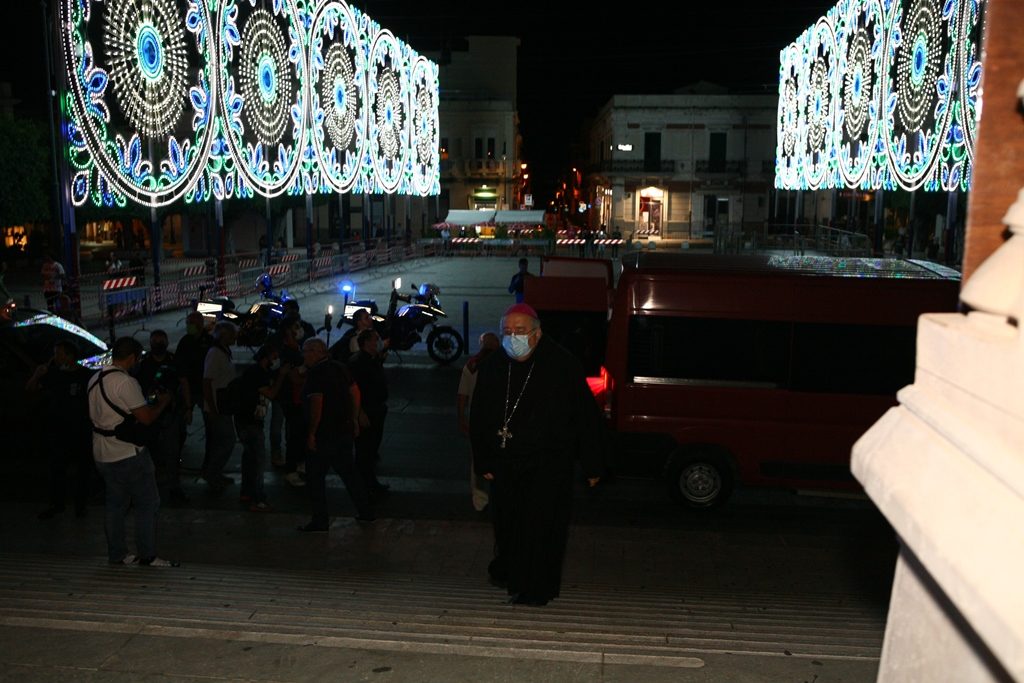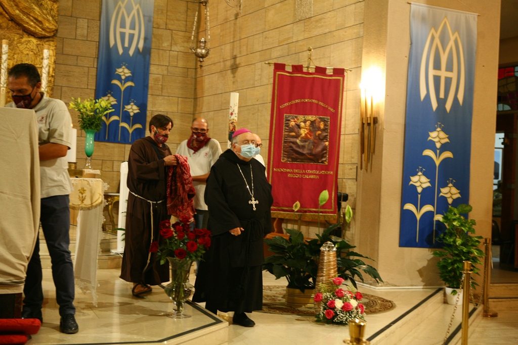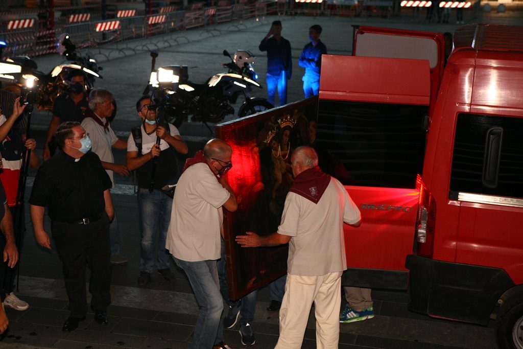 Scene da guerra a Reggio Calabria. Camionette della polizia, agenti e militari ovunque intorno piazza Duomo. La versione-Covid di Festa di Madonna è la più inedita della storia, senza processione per evitare folle e assembramenti. “Non stiamo umiliando i fedeli come dice qualcuno” ha detto l’Arcivescovo Giuseppe Fiorini Morosini, “stiamo soltanto tutelando la salute pubblica“. E allora hanno sfilato il Quadro della Madonna della Consolazione dalla sua postazione dell’Eremo e l’hanno avvolto nelle coperte, caricato su un furgone e trasferito al Duomo alle tre di notte. Letteralmente trafugato in un orario ignoto della tarda notte per tenere lontana la gente, se non fosse che il mezzo era dei Vigili del Fuoco e che comunque un po’ di fedeli si erano radunati fuori dall’Eremo aspettando tutta la notte il fatidico momento (vedi fotogallery scorrevole in alto, a corredo dell’articolo).