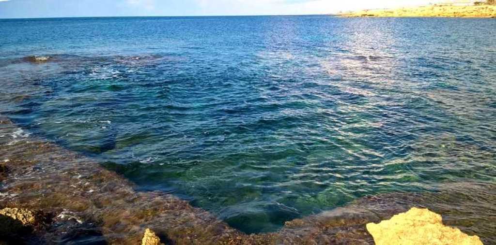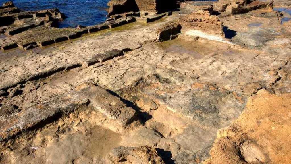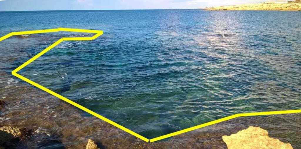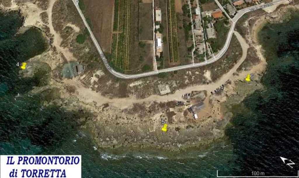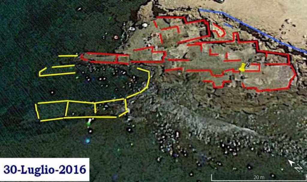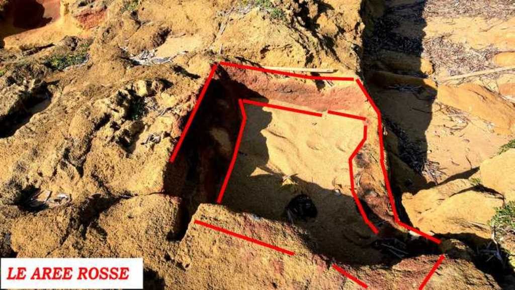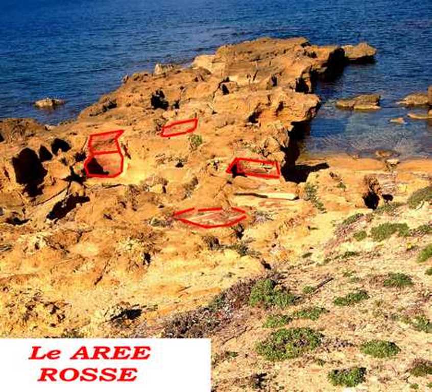 La struttura sommersa si protende verso ovest e pare abbia un braccio rientrante verso nord-ovest. Ed infine l’affascinante presenza, in una piccola area di questa scogliera, area ben definita, di numerose rocce di color rosso scuro. Le aree colorate sono numerose, spesso orizzontali ma anche verticali, in alcuni casi circondano dei grandi fornelli circolari, in altri casi invece coprono scavi perfettamente squadrati.. Le ipotesi sulla loro natura sono molteplici e tutte da verificare..Potrebbero essere anche simili a particolari formazioni di calcarenite a chiazze, presenti a Favignana..
