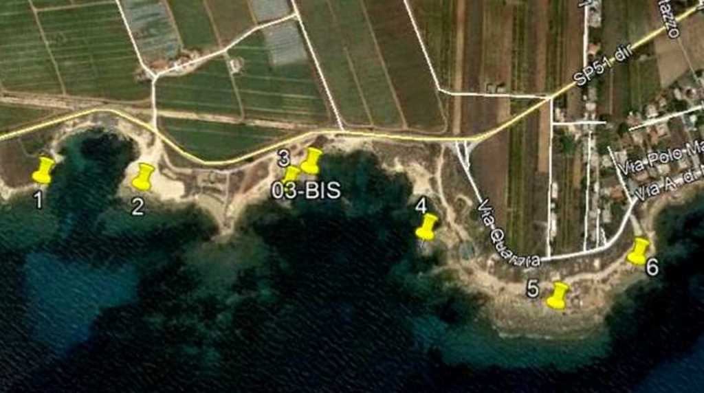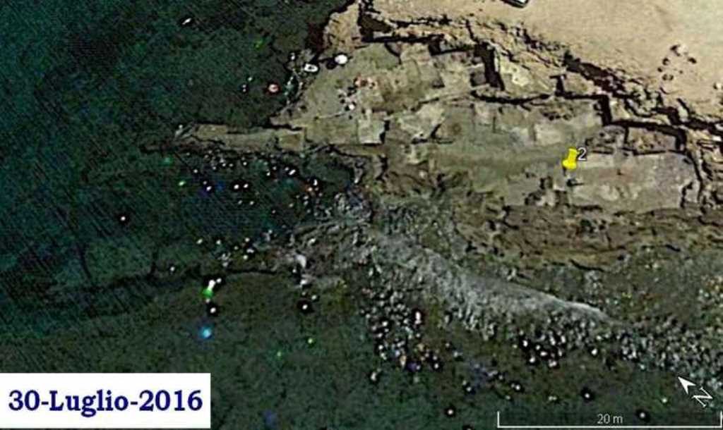 Ma, certamente, sempre in queste grandi aree devono esistere delle zone di loculi e di sepolture.. Le foto satellitari del 2016 ci fanno intravedere delle strutture sommerse… testimoni di un molo a protezione dell’approdo. La costa alta, frastagliata e quasi inaccessibile, è ricca di caverne, di piccole grotte, di anfratti e di rifugi. Le imboccature sono visibili dal mare ma raggiungere la riva non è affatto semplice. Proprio quasi a loro protezione, vi sono scogli affioranti e scogli sommersi assi pericolosi per chi non conosce bene la piccola insenatura.