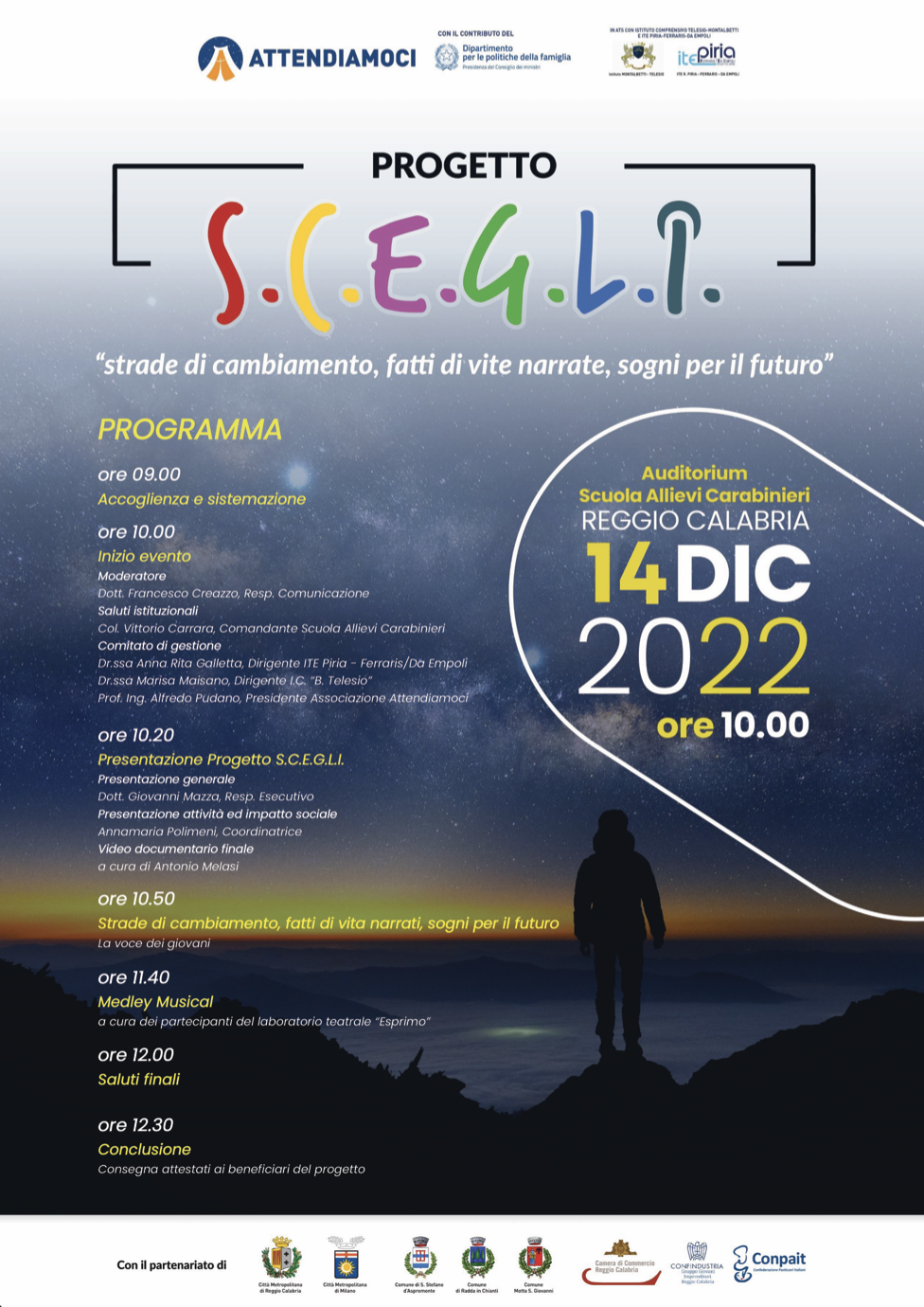 Il progetto S.C.E.G.L.I è stato selezionato all’interno del bando “Educare insieme” del Dipartimento delle Politiche per la Famiglia della Presidenza del Consiglio dei ministri ed ha avuto l’obiettivo di aiutare i ragazzi, provati da due anni di isolamento totale o parziale, a ritrovare una socialità, una direzione e riconnettersi alle proprie scelte, alle proprie passioni e, soprattutto, all’altro. Il documentario sarà presentato mercoledì 14 dicembre alle ore 10 nell’Auditorium della Scuola Allievi Carabinieri di Reggio Calabria.