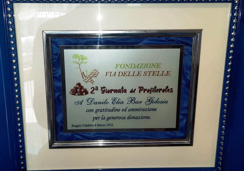 Anche quest’anno Danilo Elia, titolare del Bar Golosia di Reggio Calabria, ha ricevuto una targa come omaggio e gratitudine, da parte del presidente della Fondazione ‘Via delle Stelle’, che da anni gestisce la struttura dell’Hospice di Reggio Calabria. Il riconoscimento è stato dato ad Elia come ringraziamento per la donazione da parte del bar Golosia, del ricavato donato all’Hospice dopo la seconda sagra del Profitterol che si è svolta il 24 febbraio.