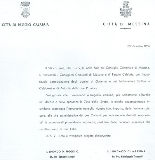 L’incontro, promosso dai due sindaci delle Città, Domenico Spoleti (Reggio) e Michelangelo Trimarchi (Messina), si concentrava sulla situazione economica di Reggio e Messina che, dopo il terremoto del 1908 ancora non erano riuscite a sollevarsi dalla tragedia.