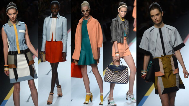 Fendi – Lo stile è decisamente bon ton anche se non mancano tocchi di originalità. Il brand propone gonne corte al ginocchio, con forme svasate e belle sovrapposizioni. Gli abiti si fanno corti e senza maniche, i pantaloni sono di pelle, i giubbotti sono corti, femminili, con dettagli trendy e materiali glamour, propongono colletti come quelli tipici delle camicie sartoriali più femminili. Tra gli accessori non passano inosservati gli occhiali da sole dallo stile futuristico, i cerchietti, ma anche deliziosi ankle boot spuntati con laccetto alla caviglia e le borse oversize da portare a mano. Il bianco e il nero sono grandi protagonisti, insieme a stampe geometriche con tonalità a contrasto come il giallo e il turchese.
