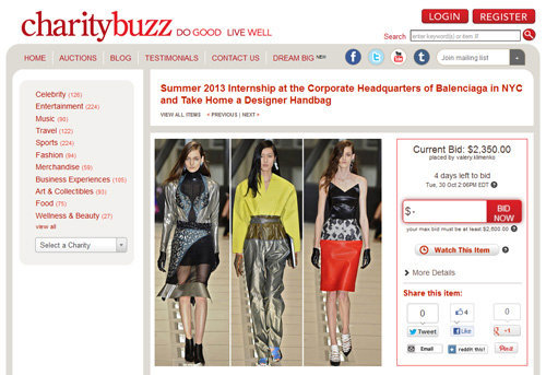Il sito americano Charity Buzz, specialista di aste a favore di associazioni benefiche, si distingue spesso per l’originalità dei metodi con cui cerca di raccogliere fondi: cene con delle celebrità, accessi VIP per vari spettacoli, e ora… stage per studenti di moda. Così, i reparti newyorchesi delle maison Balenciaga, Oscar de la Renta, Missoni e Valentino si sono prestati al gioco proponendo allo studente miglior offerente uno stage di un mese al loro fianco. Le somme raccolte attraverso quest’asta un po’ speciale verranno devolute alla associazione Rosie’s Theater Kids, che promuove lo sviluppo dei bambini attraverso la commedia teatrale.
