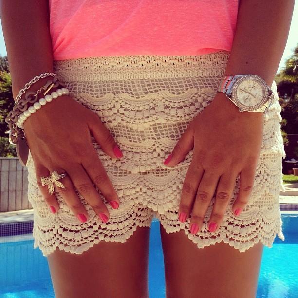 Ormai il pizzo è diventato un must di qualsiasi stagione, va bene d’estate, d’inverno, sottoforma di pantalone, di maglietta, o di abito. L’ultima novità sono gli shorts in pizzo. Tutte escono pazze per il pizzo, per il suo gioco di vedo-non vedo, perchè dà sempre un tocco di eleganza, e soprattutto perchè esiste un capo in pizzo per ogni occasione, quindi non bisogna aspettare l’evento importante per indossarlo, si può usare anche per una passeggiata di giorno con i colori fluo, per fare shopping, per andare in pizzeria, e addirittura per andare a mare.