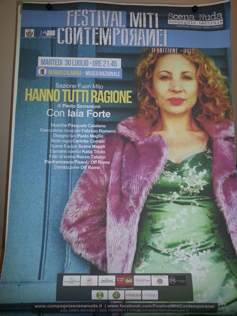 E’ una Iaia Forte felice di essere giunta a Reggio Calabria per partecipare alla kermesse teatrale del direttore artistico, Teresa Timpano, che nel corso della conferenza stampa ha orgogliosamente tratto il bilancio dell’ottima riuscita del festival. Moltissimi giovani, infatti, si sono avvicinati all’arte con il “Teatro per ragazzi” assistendo a Chianalea e Locri alle rappresentazioni de “Il viaggio di Ulisse” e la “Favola di Enea e Didone”.