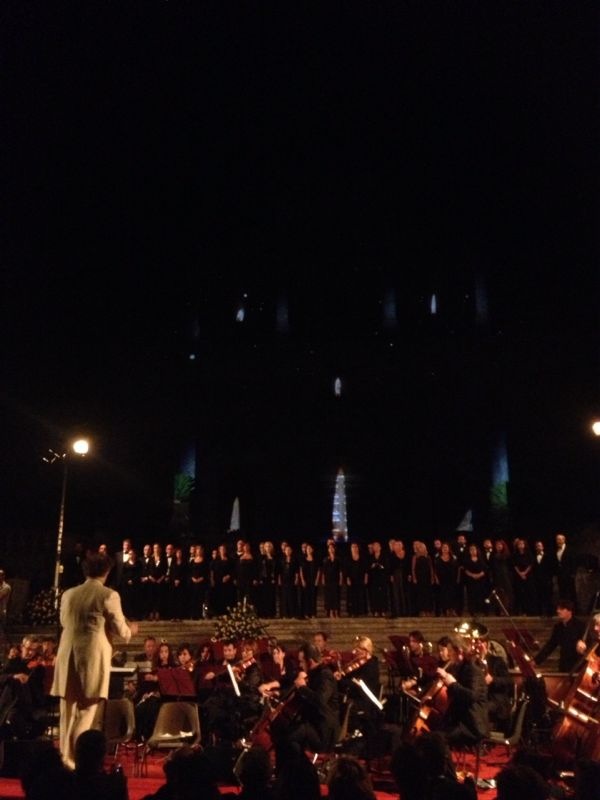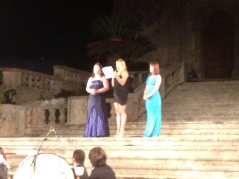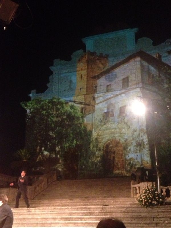 Successivamente ad un calorosissimo applauso del pubblico (che non è stato tuttavia l’unico della serata, e che ha invece accompagnato sempre fortemente gli artisti), entra il, come sempre, grandioso, Coro Lirico “F. Cilea” che ha esibito un, a dir poco sublime, degno di nota e di immenso apprezzamento per lo squisito fraseggio e per la mirabile interpretazione, “Va Pensiero” dal “Nabucco” di G. Verdi, con sullo sfondo delle immagini bellissime sul sagrato della Chiesa. A ciò è subentrato poi il presentatore della serata, il simpaticissimo e bravissimo Tiberio Timperi che, dopo aver ricordato la ricorrenza del bicentenario della nascita del maestro Verdi, ha ricordato che spesso Montalto viene definita la “Spoleto del sud” (a Spoleto si tiene infatti annualmente un grandioso festival lirico), ed ha anzi detto che “Spoleto è la Montalto del nord”, affermando un qualcosa che per noi del sud sarebbe a dir poco meraviglioso, se solo fosse vero… Si è comunque poi passati alla premiazione dei vincitori delle borse di studio, a partire da un giovane baritono “rossiniano” che si è ben esibito nel “Largo al factotum” dal “Barbiere di Siviglia” di G. Rossini, in un’apprezzabile esibizione; abbiamo poi avuto un bel soprano, vincitrice di un altro premio, che si è esibita in maniera squisita nell’aria “Quale fiamma avea nel guardo” dai “Pagliacci” di R. Leoncavallo; si è poi invece esibita la prima effettiva ospite della serata, il soprano Adriana Damato, che si è esibita bene nell’aria “La Vergine degli Angeli” dalla “Forza del destino” di G. Verdi, accompagnata in modo molto toccante dal coro; questa esibizione è stata tuttavia molto particolare, oltre che per gli artisti, per le proiezioni sulla Chiesa, ed in particolare per il finale dell’aria in cui è comparsa una grande immagine della Madonna sulla Chiesa.