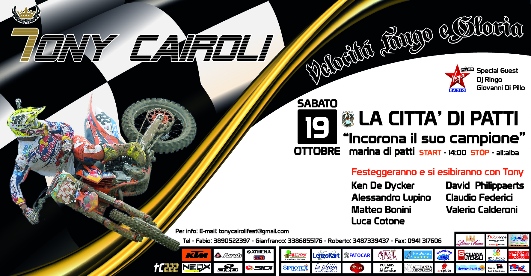 E’ iniziato il conto alla rovescia per dare il via alla festa ufficiale per salutare “il re”, il campione di motocross Tony Cairoli. Il programma è “tutto in evoluzione” come dice Mauro Aquino il sindaco di Patti, a capo del pool di amici e tifosi di Cairoli che già da giorni sono all’opera per ottimizzare, pianificare, concordare, incastonare i tanti appuntamenti della giornata.