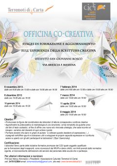 Sono 30 le insegnanti e gli aspiranti coordinatori che sabato 9, alle ore 9, all’istituto San Giovanni Bosco di Messina, daranno inizio al 1° Stage di “Officina Co-Creativa”, coordinato da uno dei massimi esperti dell’esperienza della scrittura creativa a livello nazionale, Stas’ Gawronski. A dare il benvenuto ai partecipanti sarà Suor Marisa Prestigiacomo, direttrice dell’Istituto San Giovanni Bosco, alla presenza dell’assessore alla pubblica istruzione, Patrizia Panarello; del direttore della Biblioteca Regionale di Messina, Sergio Todesco, dei presidenti del Cidi di Messina, Alberta Mariotti, e dell’Associazione Culturale “Terremoti di Carta”, Nancy Antonazzo. L'”Officina Co-creativa” – suddivisa in sette incontri con cadenza mensile – ha per oggetto il ruolo della scrittura creativa sia come percorso didattico che come esperienza personale. I laboratori fanno parte delle iniziative formative promosse dal Cidi (Centro Iniziativa Democratica Insegnanti), quale soggetto qualificato per la formazione dei docenti, sono riconosciuti dal Miur e danno diritto all’esonero dal servizio per il personale scolastico che vi partecipa.