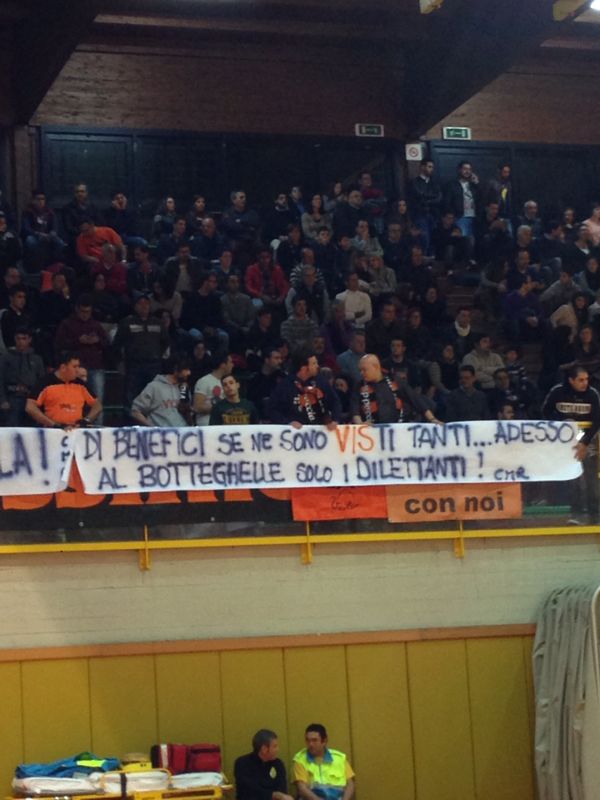 Che ai tifosi della Viola non vada giù che la propria squadra non possa giocare le gare interne al PalaBotteghelle, è cosa risaputa, ma oggi in occasione della sfida contro Lucca vinta per 65 a 64, i sostenitori neroarancio hanno esposto due striscioni attaccando le istituzioni e la società della VIS alla quale è stata affidata la gestione del palazzetto. A nulla sono servite in settimana, le precisazioni della Vis in merito alla mancata concessione dell’agibilità. (Foto Valerio Chinè)
