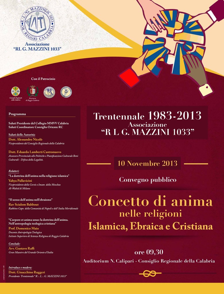 “Il concetto di Anima nelle religioni islamica, ebraica e cristiana” è il leit-motiv del convegno pubblico, organizzato dall’Associazione “RL Giuseppe Mazzini n. 1033”, per celebrare il trentesimo anniversario della sua fondazione, che si terrà domenica 10 novembre 2013 alle ore 09:30, presso l’Auditorium Calipari di Palazzo Campanella a Reggio Calabria.