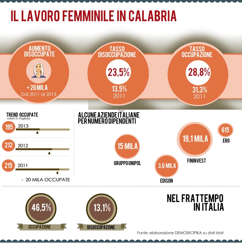 Il peso della crisi continua ad alimentare il disagio sociale in Calabria, soprattutto tra le donne: il tasso di disoccupazione femminile nel 2013 è balzato al 23,5%, in rialzo di ben 10 punti percentuali rispetto al 2011. Il che si traduce in quasi 60 mila donne calabresi in cerca di lavoro, vale a dire oltre 26 mila disoccupate in più rispetto al 2011. Parallelamente la quota di occupate si è contratta di quasi 2,5 punti percentuali tra il 2011 ed il 2013 con circa 20 mila posti di lavoro persi tra le donne in soli due anni.