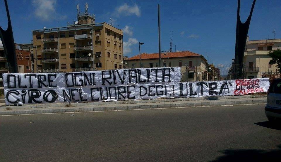 “Oltre ogni rivalità, Ciro nel cuore degli ultrà“: con uno striscione molto grande affisso alla rotonda del ponte della Libertà, gli Ultrà della Reggina ricordano Ciro Esposito, il tifoso napoletano morto in ospedale a Roma tra martedì 24 e mercoledì 25 giugno dopo la sparatoria in cui era rimasto gravemente ferito il 3 maggio scorso durante gli incidenti avvenuti fuori allo Stadio Olimpico di Roma, in occasione della finale di Coppa Italia tra Napoli e Fiorentina.