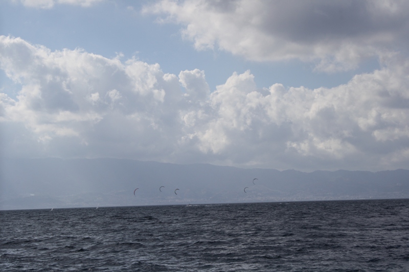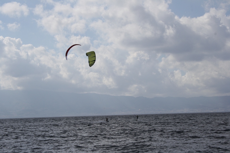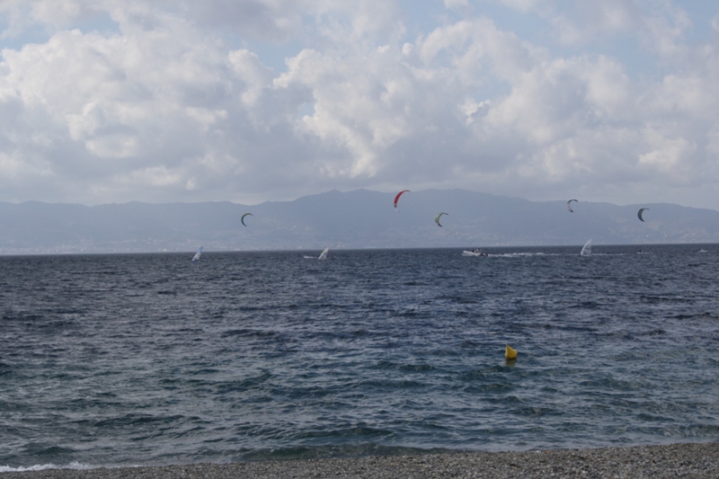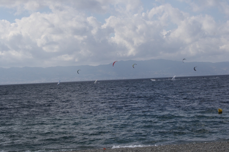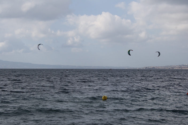 Il tempo non è dei migliori per la traversata; non per niente, alcuni atleti sono già tornati a riva, altri si stanno ancora “destreggiando” con la vela nelle acque dello Stretto di Messina.
