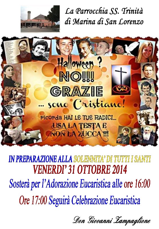 Halloween e’ una festivita’ anglosassone che trae le sue origini da ricorrenze celtiche che ha assunto negli Stati Uniti forme macabre e spesso violente e che si celebra la notte del 31 ottobre. L’usanza poi si e’ diffusa in tutto il mondo e ha assunto un carattere consumistico tanto da venire festeggiata come “festa del costume”. I colori tradizionali di questa festa sono il nero, il viola e l’arancione, mentre i temi che vengono portati avanti sono quello della morte, del male e dell’occulto. La Chiesa Cattolica non ha mai approvato questa festa e sconsiglia di parteciparvi in quanto avvicina al mondo dell’occulto e del satanismo. In preparazione alla Solennita’ di Tutti i Santi , venerdi’ 31 ottobre, alle ore 16, ci dice il parroco don Giovanni Zampaglione, la comunita’ di S. Lorenzo Marina (RC), sostera’ dinanzi a Gesu’ per l’Adorazione Eucaristica e poi ci sara’ la Celebrazione Eucaristica. L’invito e’ rivolto a tutti i giovani e a tutti coloro che vogliono partecipare in maniera da ricordare le nostre radici che non possono, ne devono venir meno, dinanzi a queste feste profane e consumistiche che non ci appartengono e spesso ci allontanano da esso….. “Mi permetto a questo proposito -continua ancora don Zampaglione – di ripetere a tutti lo slogan: Halloween? NO GRAZIE: SONO CRISTIANO” ….. P.S. Apriamo gli occhi e cerchiamo di USARE LA TESTA NON LA ZUCCA!!!!!!!!!!!!!