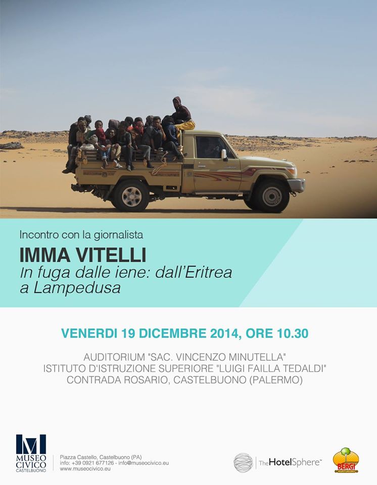 Venerdì 19 dicembre 2014 alle ore 10.30 presso l’Auditorium “Sac. Vincenzo Minutella” dell’Istituto d’Istruzione Superiore “Luigi Failla Tedaldi” di Castelbuono avverrà l’incontro con la giornalista dal titolo “In fuga dalle iene: dall’Eritrea a Lampedusa, che si terrà”.