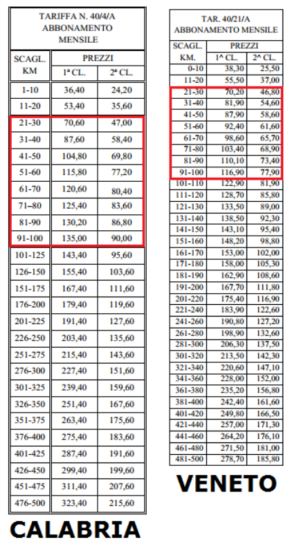 Come possiamo notare, nei due scaglioni 0-10 km e 11-20 km, gli abbonamenti ferroviari calabresi in seconda classe, costano poco meno di quelli veneti (circa un’euro in meno). Ma dallo scaglione 21-30 km in poi, avviene l’incredibile. In Veneto, nonostante il servizio ferroviario sia di standard teutonico…si paga meno che in Calabria, dove il trasporto pubblico locale ha raggiunto livelli da terzo mondo! Addirittura nella fascia 91-100 km, l’abbonamento mensile veneto costa 77,90 €, a differenza dei 90 € della Calabria! Circa 12 euro di differenza, ogni mese: in pratica 144 in meno all’anno, per viaggiare in Veneto con treni ogni ora ed ogni mezz’ora, con materiale rotabile moderno ed affidabile, e con servizi a tutte le ore della giornata ed in coincidenza tra di loro. Una differenza con le fasce chilometriche calabresi, la notiamo dalla 91-100 in poi. Mentre in Calabria le fasce successive vengono conteggiate ogni 25 km, in Veneto si salta alla successiva ogni 10 km. Facendo però un rapido raffronto, ci rendiamo conto che continua a non esserci paragone tra le due regioni, con abbonamenti molto più economici in Veneto!