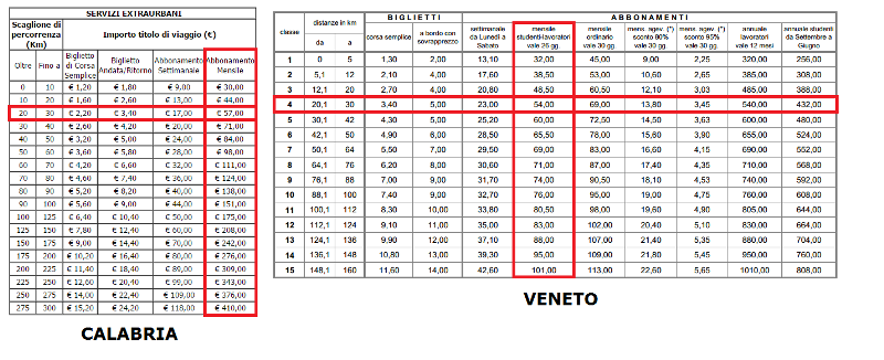 In Veneto, pur di base essendo più caro il trasporto su gomma rispetto alla Calabria, esiste la tipologia di abbonamento mensile per studenti/lavoratori, che vale 26 giorni al mese e che esclude ovviamente le domeniche, quando ovviamente lo studente o il lavoratore il bus non lo prende. Come possiamo notare, dalla fascia chilometrica 20-30 in poi, questa tipologia di abbonamento veneto batte assolutamente quello calabrese mensile, valido 30 giorni (di cui almeno 4 rischiano di essere pagati a vuoto). Per fare un esempio, nella fascia “veneta” 50,1 – 64 km, l’abbonamento costa 69 €, mentre nella fascia “calabrese 50-60 km, si arrivano a spendere addirittura 98 €…ben 29 € in più! In pratica, in Veneto si risparmiano decine di Euro per prendere un bus che permette all’utenza di avere coincidenze con i treni, che ha delle fermate segnalate regolarmente (a differenza della Calabria, dove chi non è del luogo non riuscirà mai a trovare le fermate senza l’indicazione di qualche abitante locale), e che non “ruba” denaro al cittadino, che indirettamente deve tenere in piedi un sistema di trasporto in sovrapposizione, e quindi costoso e poco funzionale.