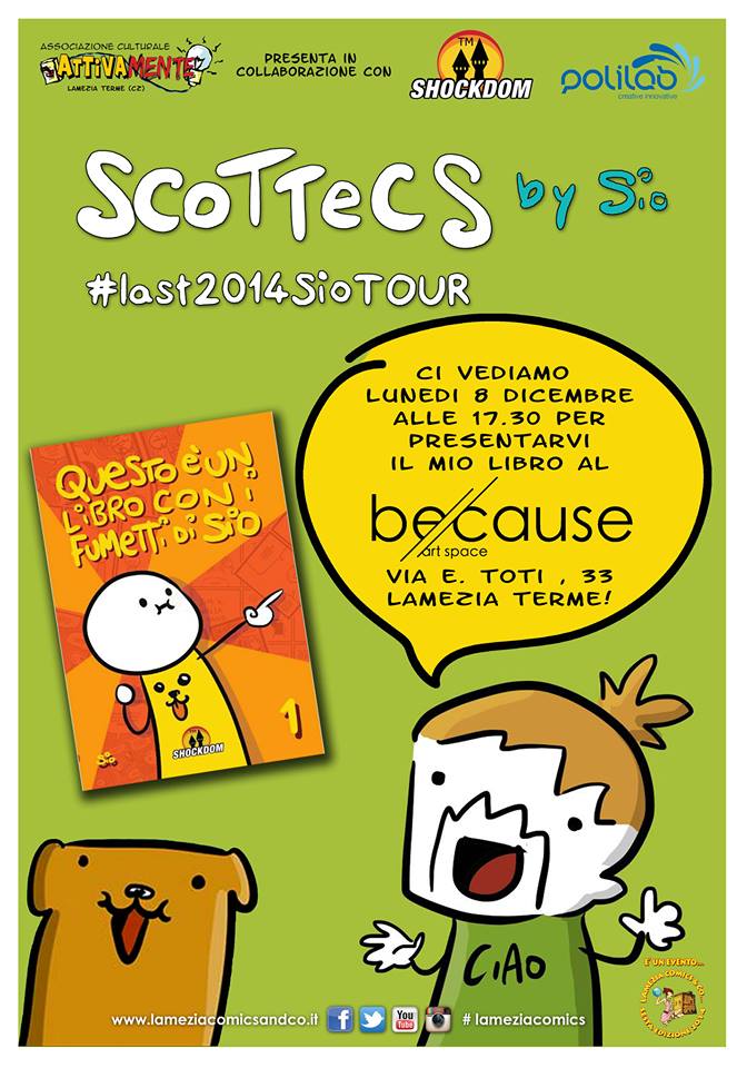 Lunedì 8 dicembre nei locali del Because Art Space, in via E. Toti 33, il noto fumettista e youtuber invita tutti quanti ad una delle sue ultime presentazioni dell’anno, ovviamente lo fa nel suo stile “venite a darmi il cinque in faccia a Lamezia Terme! Ci sarà il mio nuovo libro, “Questo è un libro con i fumetti di Sio”, quello vecchio (spero), “Tutto Tutto Scottecs” e pure un robot a forma di avverbio!”.