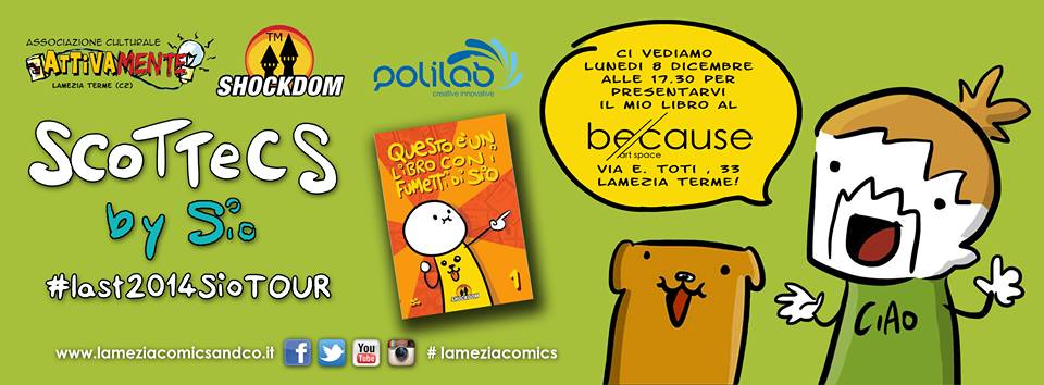 Lunedì 8 dicembre nei locali del Because Art Space, in via E. Toti 33, il noto fumettista e youtuber invita tutti quanti ad una delle sue ultime presentazioni dell’anno, ovviamente lo fa nel suo stile “venite a darmi il cinque in faccia a Lamezia Terme! Ci sarà il mio nuovo libro, “Questo è un libro con i fumetti di Sio”, quello vecchio (spero), “Tutto Tutto Scottecs” e pure un robot a forma di avverbio!”.