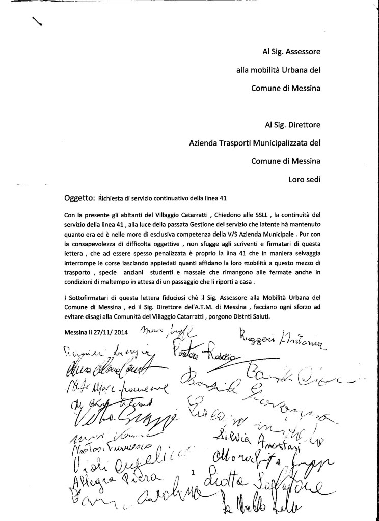“Il villaggio di Catarratti e il rione Bisconte di Messina patiscono ormai da troppo tempo i reiterati disservizi del trasporto pubblico per l’assenza o la discontinua presenza della linea 41″ scrive in una nota Libero Gioveni consigliere comunale, che rivolgendosi alle autorità, presenta una petizione popolare preparata dagli stessi abitanti di Catarratti sempre più esasperati per i gravi disagi a cui vanno giornalmente incontro ed esprime fiducia “verso un benevolo accoglimento delle loro istanze, al fine di soddisfare il sacrosanto diritto alla mobilità urbana di questa nutrita fetta di utenti messinesi.”