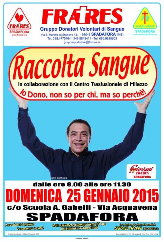 Donare è un gesto meraviglioso e doveroso per dimostrare amore e fratellanza. “La Fratres non si stancherà mai di ringraziare quanti sono sempre stati pronti a rispondere alla chiamata di aiuto verso il prossimo nel 2014 e spera, con umiltà, di poter ripetere e migliorare gli eccellenti risultati anche per il 2015, perché crediamo che una società solidale, sia fondamentale la crescita di una società sana e serena”, queste le parole del Presidente Remigare Arturo, che con grande entusiasmo ha voluto esternare la propria soddisfazione per quanto fatto nel corso dell’anno appena terminato, lanciando la sfida per il futuro. La Fratres, pertanto, invita tutti giorno 25 gennaio, a prendere parte alla prima giornata del 2015 dedicata alla donazione sangue, che si terrà presso la scuola “Aristide Gabelli” di Spadafora, per iniziare con un gesto di solidarietà il nuovo anno.
