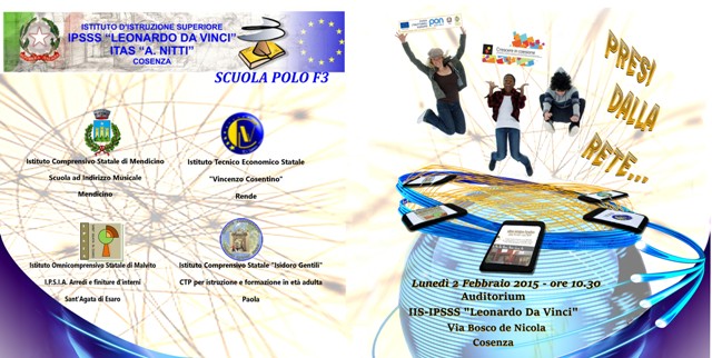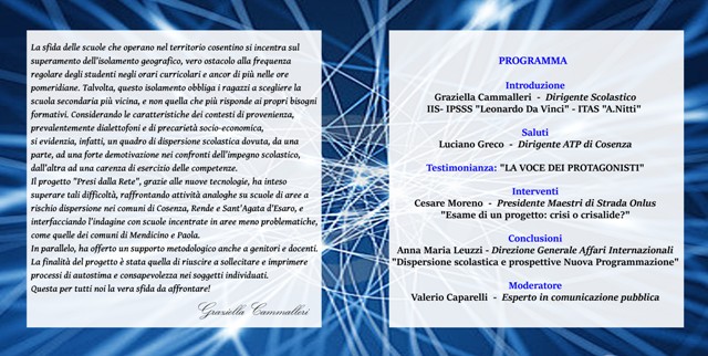 I risultati ottenuti dal progetto “Presi dalla Rete” saranno illustrati alle autorità scolastiche il prossimo Lunedì 2 Febbraio 2015, alle ore 10.30, presso l’Auditorium dell’Istituto Superiore “Da Vinci” di Cosenza (ingresso Viale Parco). Alla manifestazione, introdotta dalla dirigente dell’istituto, Graziella Cammalleri, presenzierà la dirigente dell’Ufficio IV della Direzione Generale per gli Affari Internazionali del MIUR, Anna Maria Leuzzi, accompagnata nell’occasione dal Dirigente dell’ATP di Cosenza, Luciano Greco. L’iniziativa, moderata dal giornalista Valerio Caparelli, vedrà la partecipazione del famoso presidente dell’associazione Maestri di Strada Onlus, Cesare Moreno, e dei ragazzi dei cinque istituti che hanno preso parte al progetto. Saranno loro i principali testimoni della giornata conclusiva, intervenendo con una rassegna delle attività svolte dal progetto nella sessione mattutina denominata “La Voce dei Protagonisti“.