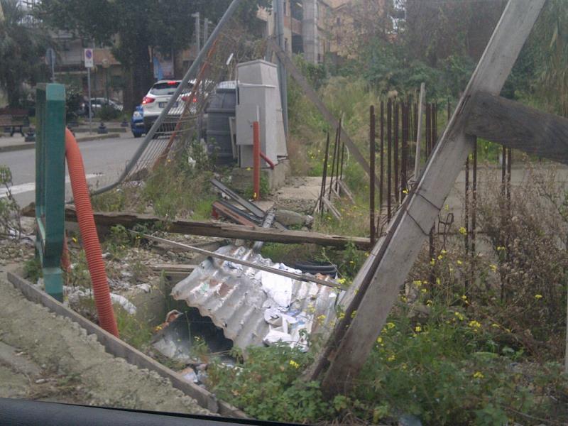 Segnalazione a StrettoWeb su una situazione di degrado ed incuria a Catona. Il lettore afferma: “sono passati forse 10-12 anni da quando furono bloccati i lavori per la costruzione di un palazzo in pieno centro a Catona. Ebbene-continua- negli anni le intemperie e qualche incidente stradale ha quasi completamente divelto le precarie barriere ed i cavi elettrici che sembrano scoperti. Speriamo che -conclude- i vigili e le forze dell ordine intervengano in maniera decisa anche per una questione di decoro urbano.